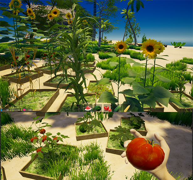 You can grow 7 kinds of coconut trees,apple trees,bamboo,Watermelon, tomato, cucumber, strawberry,wheat, corn, carrot (more trees and crops in the future). When you have seed and water, you can watch it break out of the ground, grow dynamically into a big tree, and then if you need to cut it with an axe to get trees and fruits, create your own forest and flower sea, beautify your warm home.