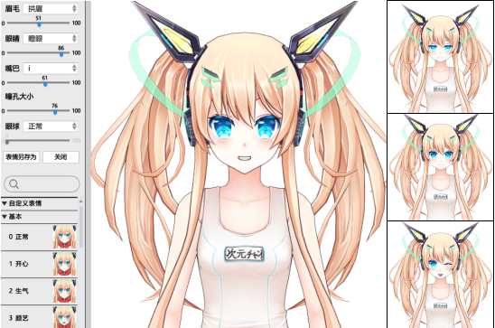 자신만의 감정표현을 사용자가 지정할 수 있습니다. 매개 변수를 캐릭터의 얼굴로 드래그하면 즉시 적용됩니다.