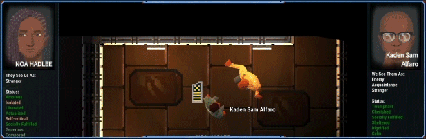 Each crew member runs an AI that is constantly making choices based on their current needs and past experience. If one colleague is consistently comforting, and another threatening, an AI will seek out the former when they need security.