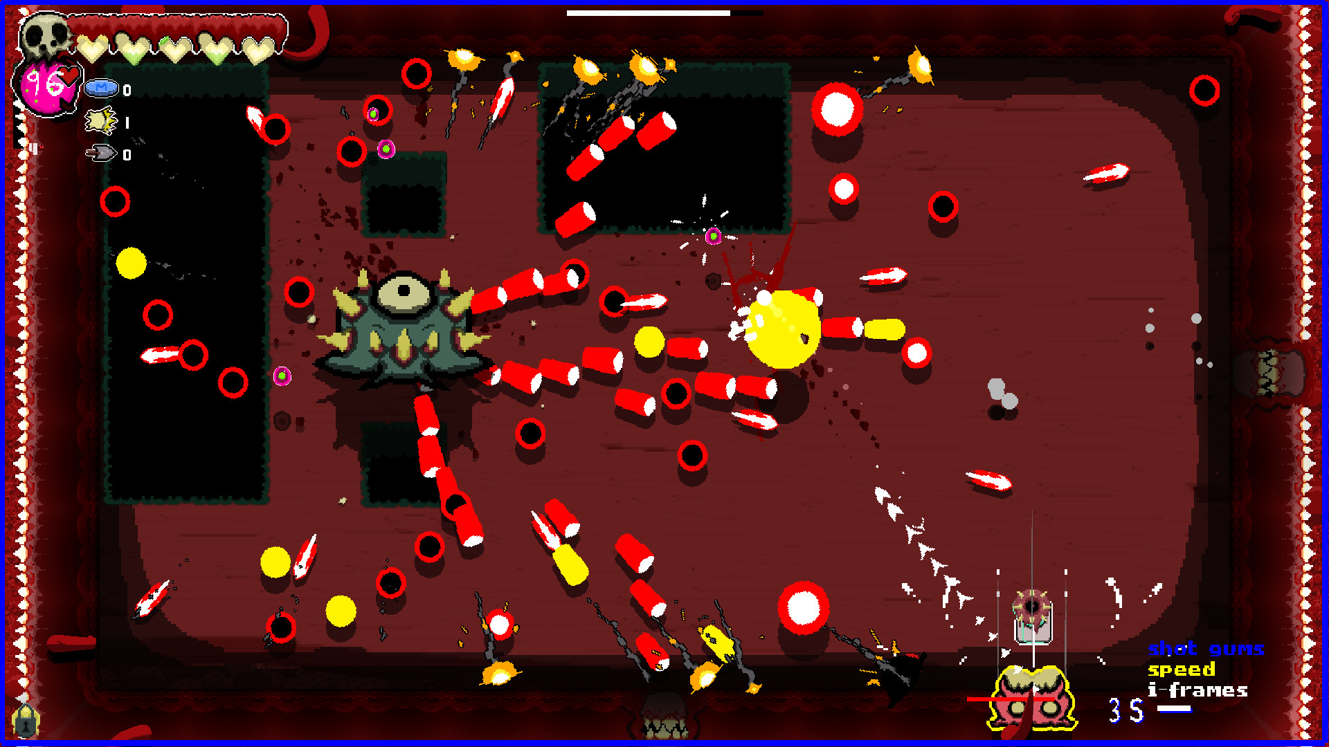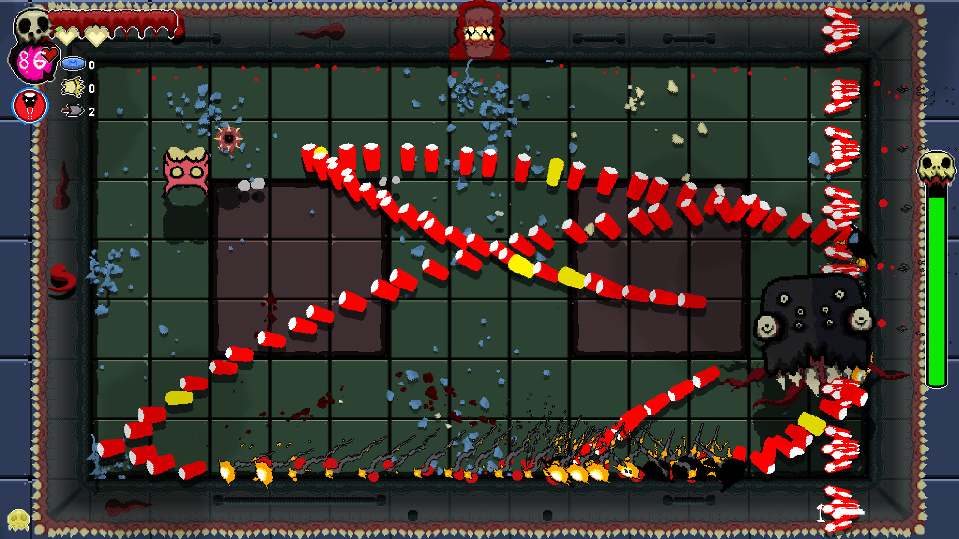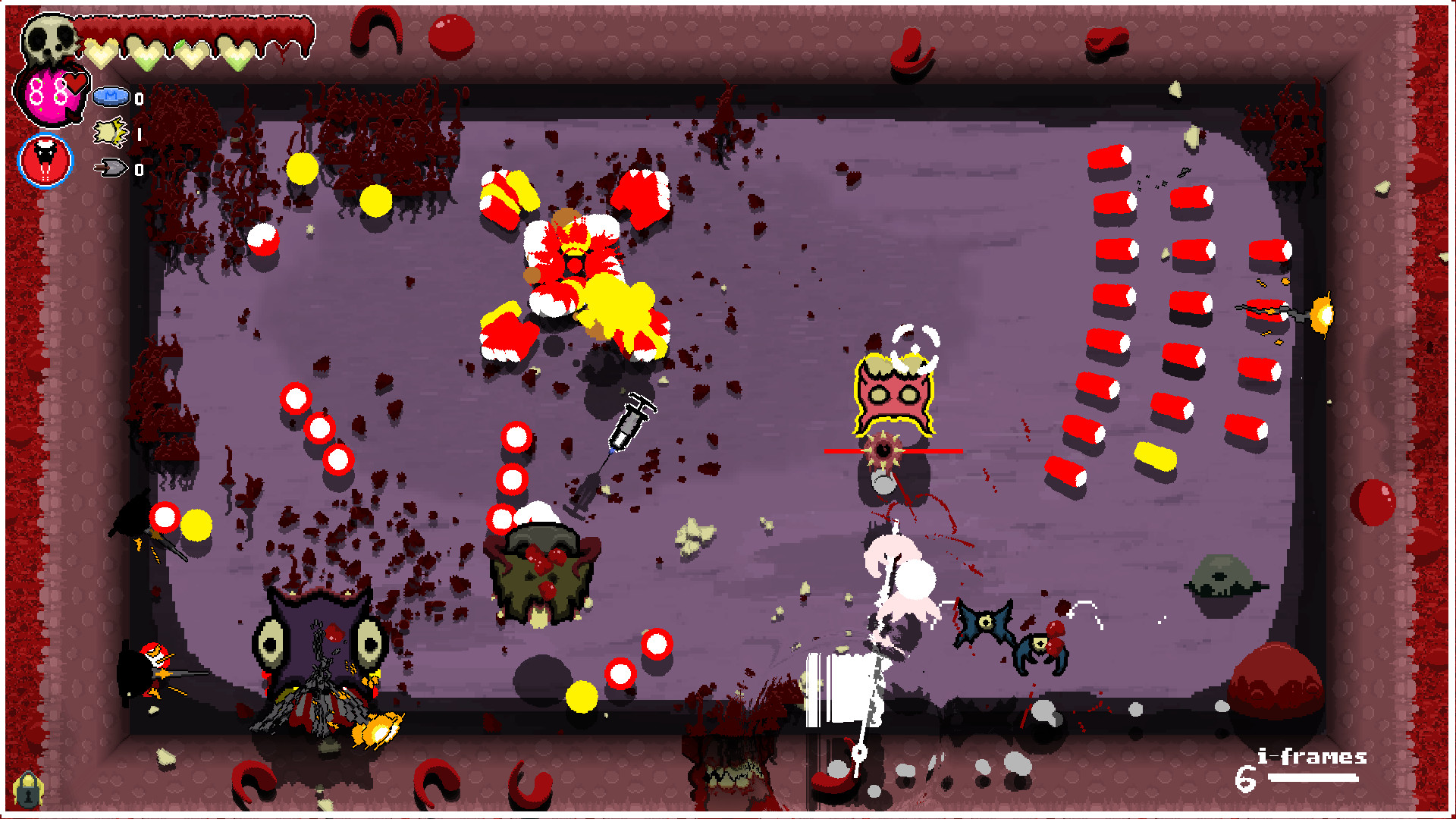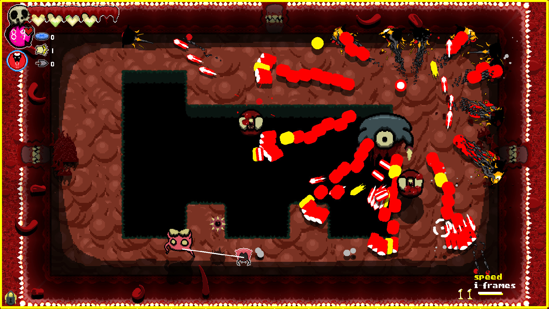 Contract diseases as you play. Diseases are powerful but come at a price. Do you risk the poison of diarrhea for the speed and urgency it creates in you? Leave the disease behind, and the body will consume the disease increasing the difficulty. Take entamaphobia to give all doorways a powerful laser. However, doors now cause damage by going through them. There's a creature that can administer a cure. But where and when you find him is unknown.