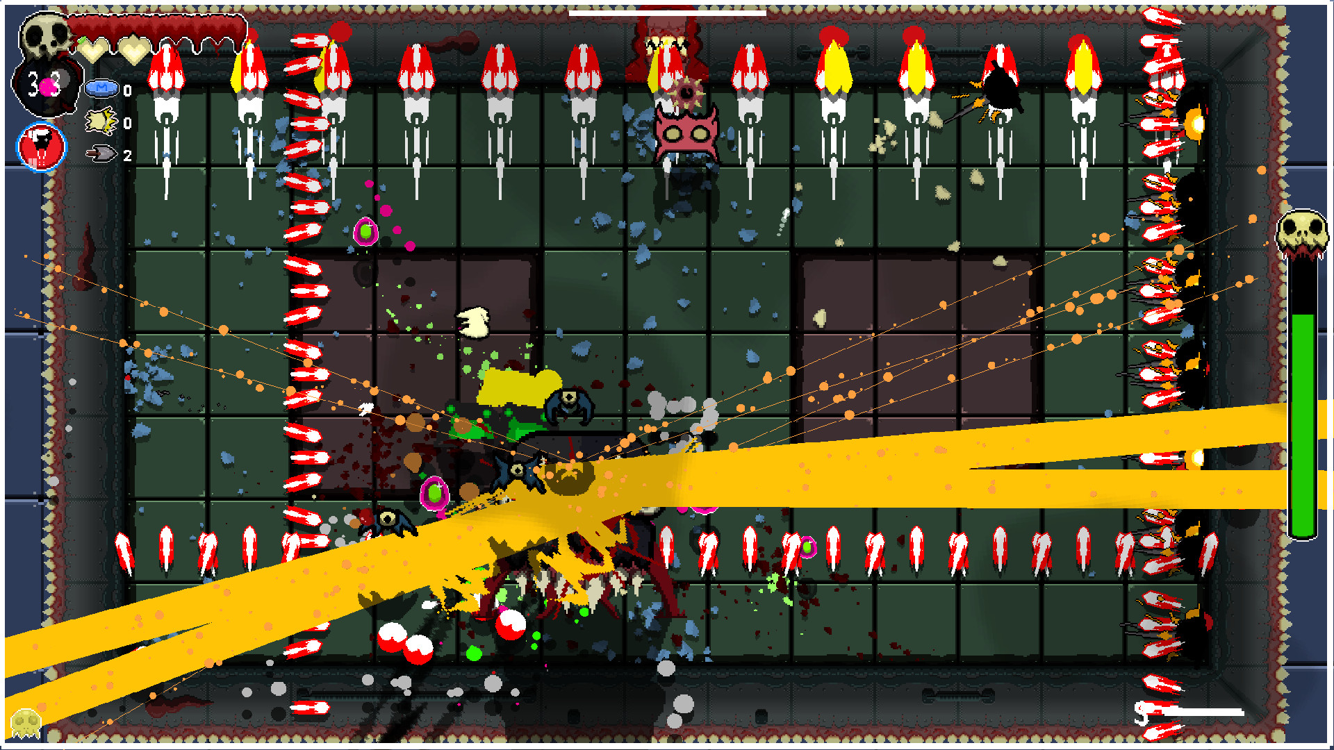 Use the agility and stickiness of your little gummy to run on walls to escape bullet hells. Initiate slomo to find a path through a maze of bullets. Jump high into the air to get a better view or to dodge an impossible amount of bullets. While your in the air, why not take the time to reflect on your life. The purchase you made....WAIT! That enemy is stunned! JUMP ON IT!!! As a kid, did you ever try to re-insert your baby tooth back into its gummy cavity? No? Well now's your chance! Shoot your tooth and suck back! Time it just right to inflict extra damage.