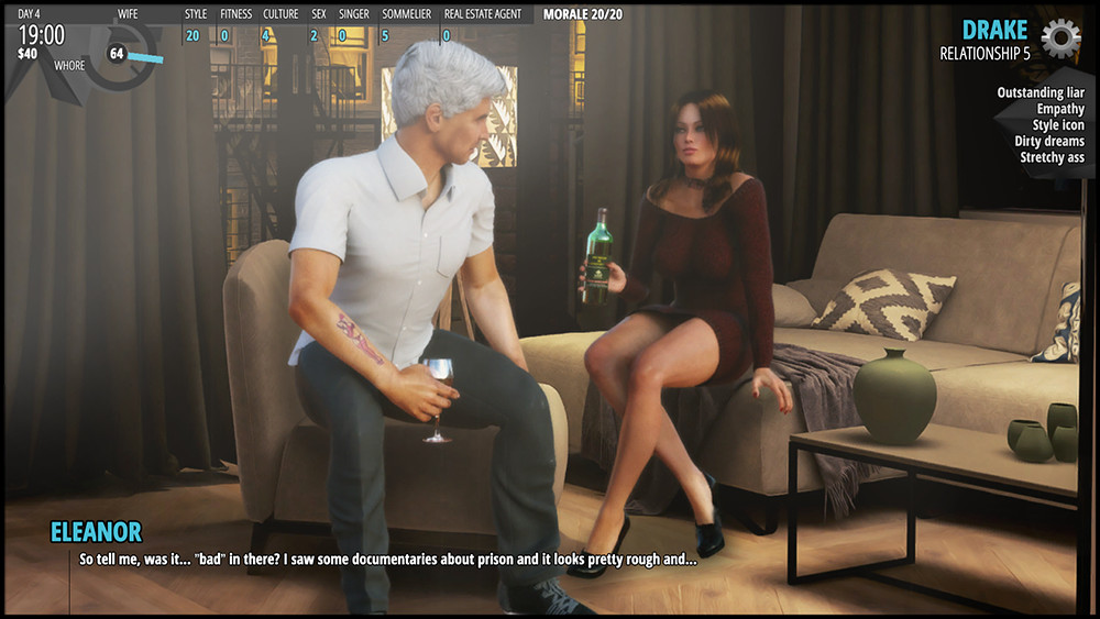 Eleanor 3 is a dating sim where you need to make various choices and perform actions based on a daily schedule in order to put her life on the right track. In this story, you'll meet characters from the previous parts as well as new ones. You're in command here, so, according to your actions, Eleanor will become their best friend or... take off her panties in front of them, exposing her wet cunt while awaiting their rough touch. But hey - she is married, so don't forget to balance life between her wifely duties and her more adventurous lifestyle. Though maybe balance is overrated?