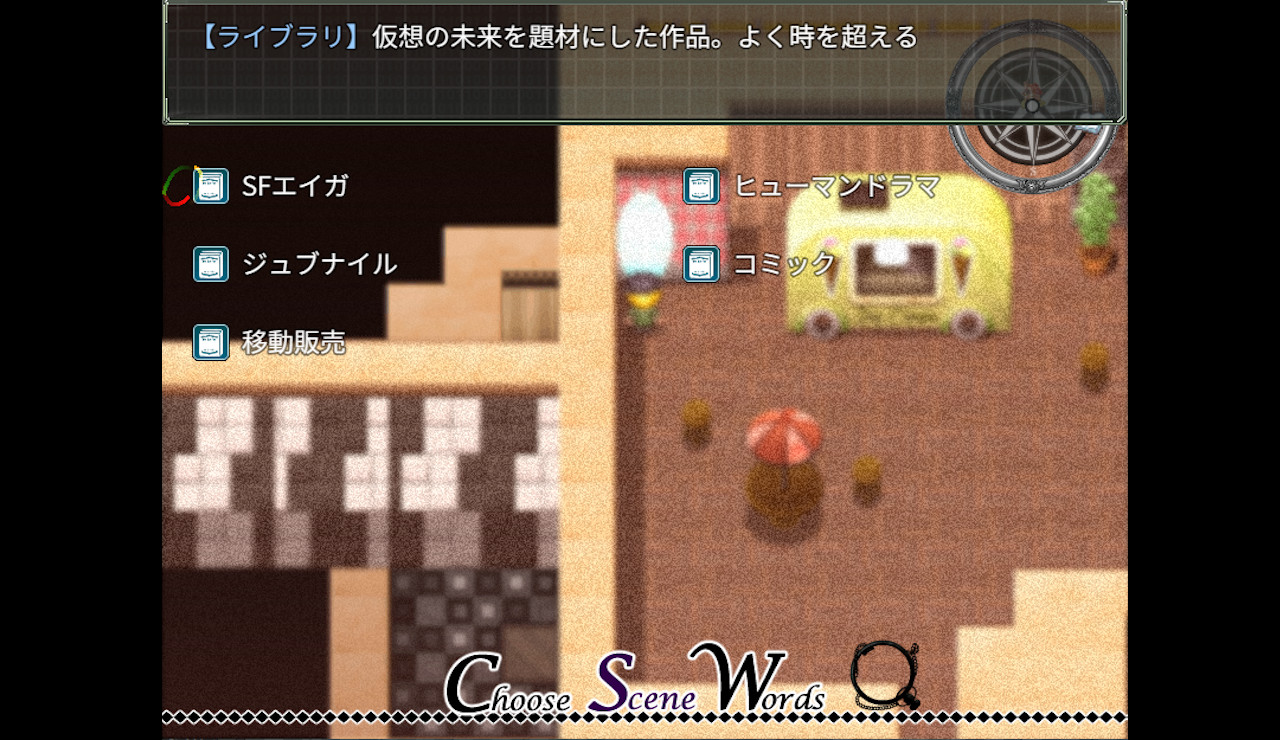 - Library: Explanation of the world view, game hints, and event options