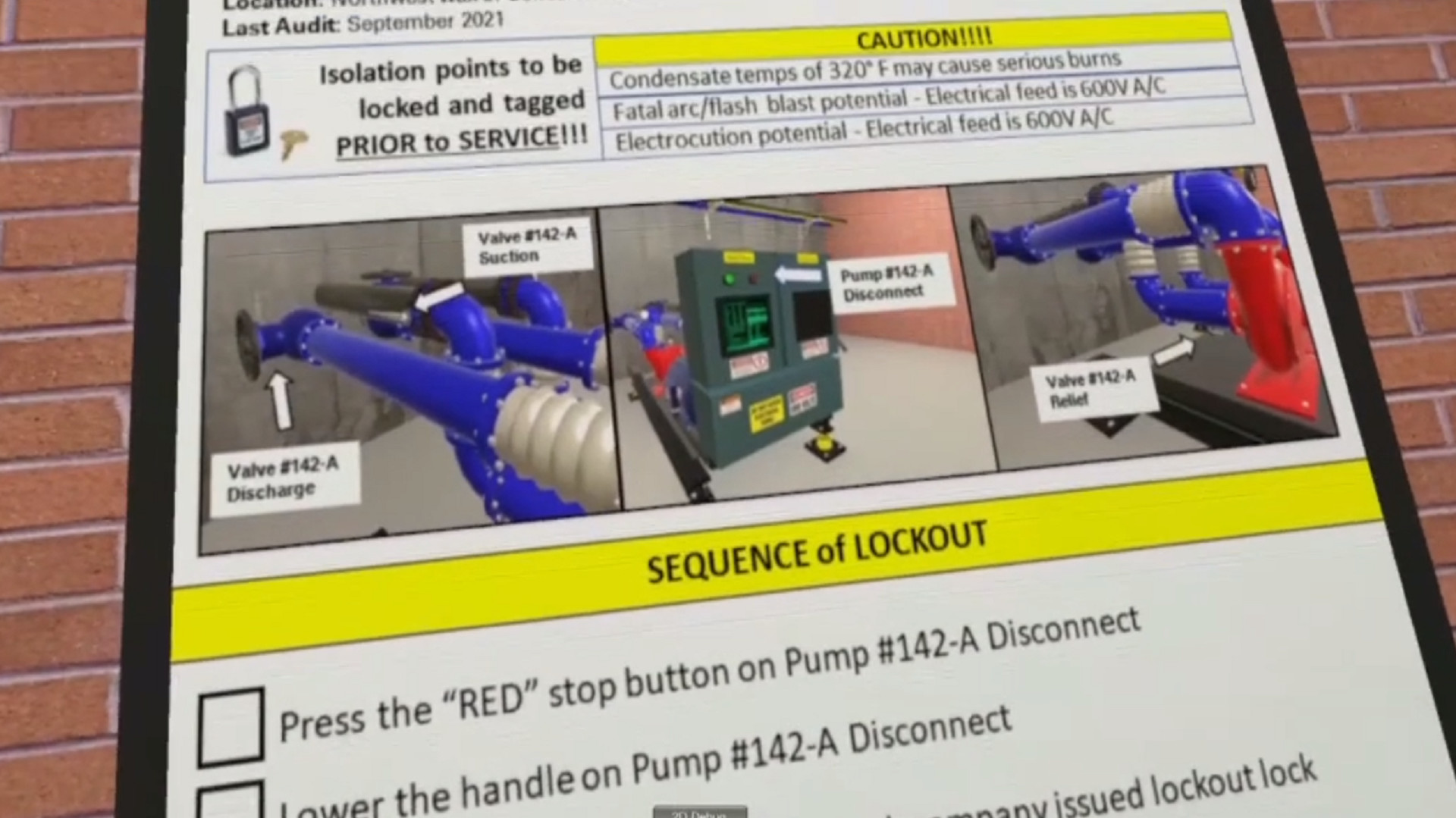 This Simple LOTO Simulator was developed to provide employers of any size, with the safest and most cost effective method to verify their employee's understanding of the Energy Control Procedure, an integral piece of any Control of Hazardous Energy (lockout/tagout) Program. This Energy Control Procedure can be viewed on a digital screen, and interacts as the user proceeds through the simulator. A check mark will appear next to each step in the corresponding "Sequence of Lockout" and "Release from Lockout" as the participant completes that task. However, our objectives manager tracks each step and ensures each step is not only completed, but that it is also done in the correct sequence, just like with a real energy control procedure.