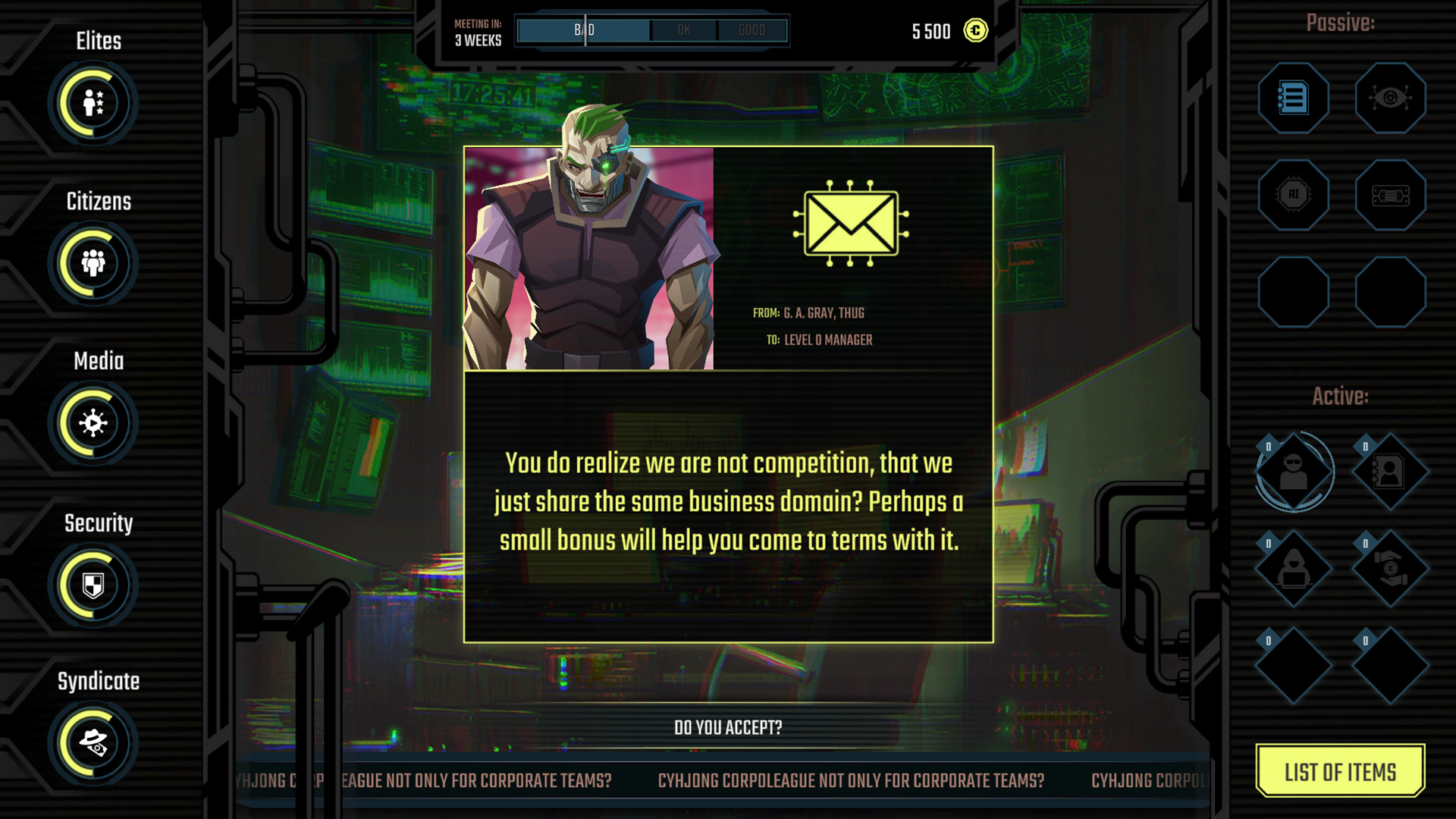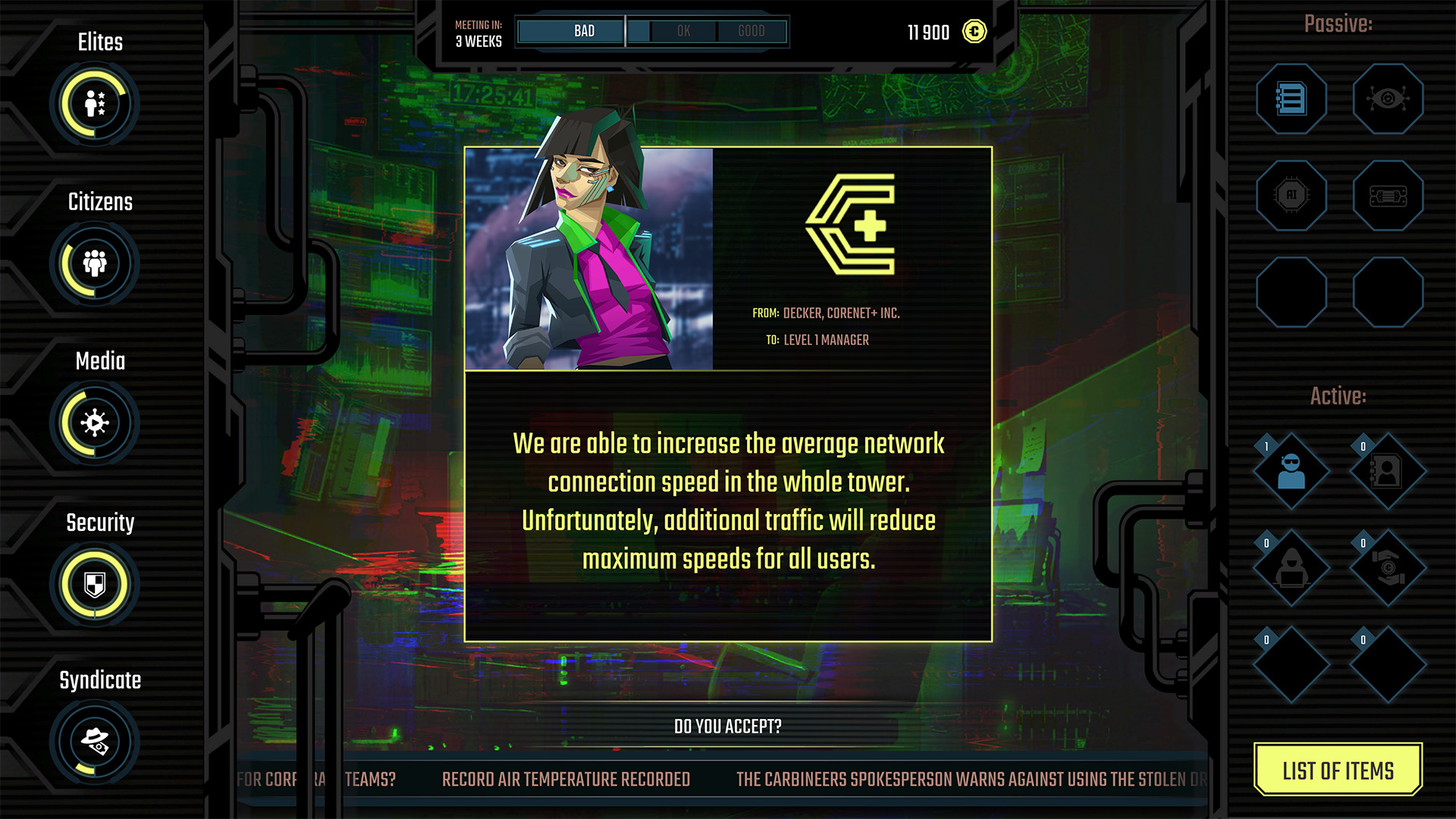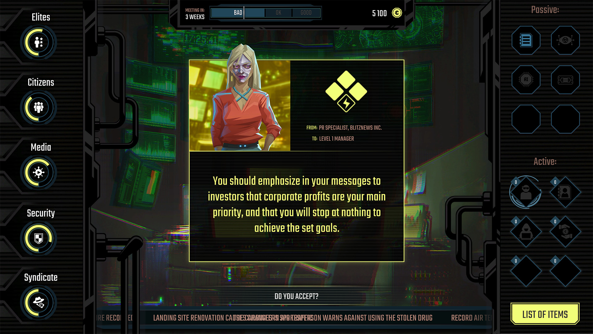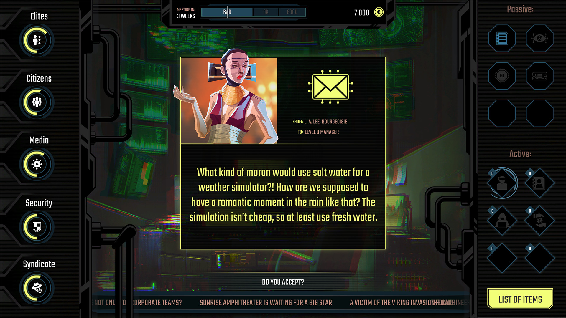 이 사이버펑크 세상의 기술은 가장 높은 발전 단계에 도달했고 모든 종류의 사이버 적용과 유전자 조작은 흔한 일입니다. 대부분의 사람들은 살아있는 식물이나 동물을 보지 못했습니다. 바다 한가운데 세워진 독립된 도시 국가인 "바빌론 6" 시민의 삶은 당신의 결정에 달려 있습니다.