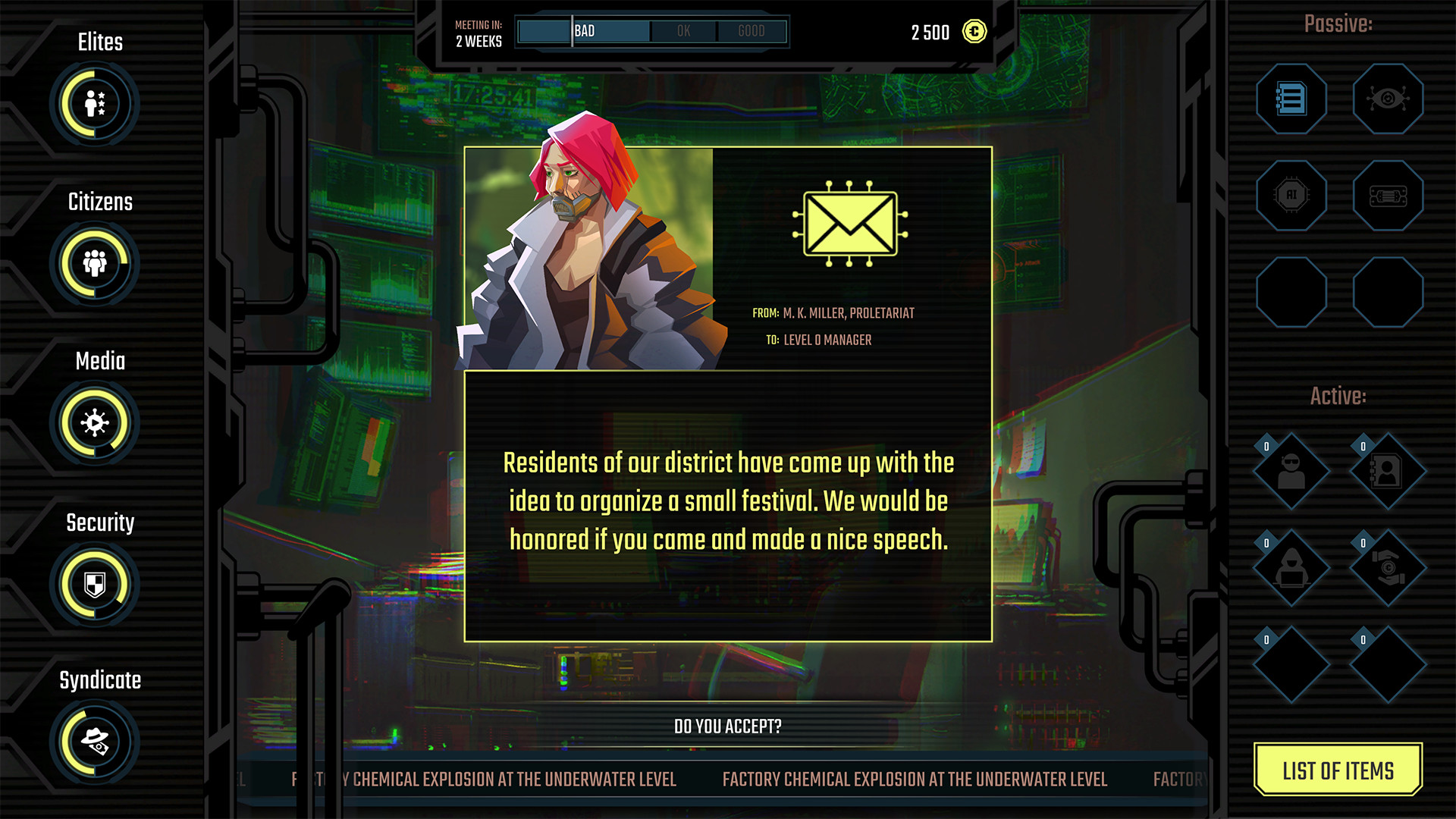 당신은 매 주마다 엘리트, 시민, 언론, 범죄 통치자, 보안의 균형을 잡기 위해 노력하면서 예측 불가능한 도시에서 또 다른 중요하고 무작위적인 요청을 받게 됩니다. 아프고 다친 사람들을 어떻게 치료할 건가요? 현재 어느 편에 있는지 알아야 합니다.