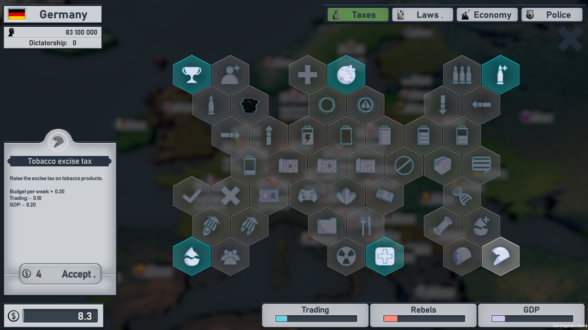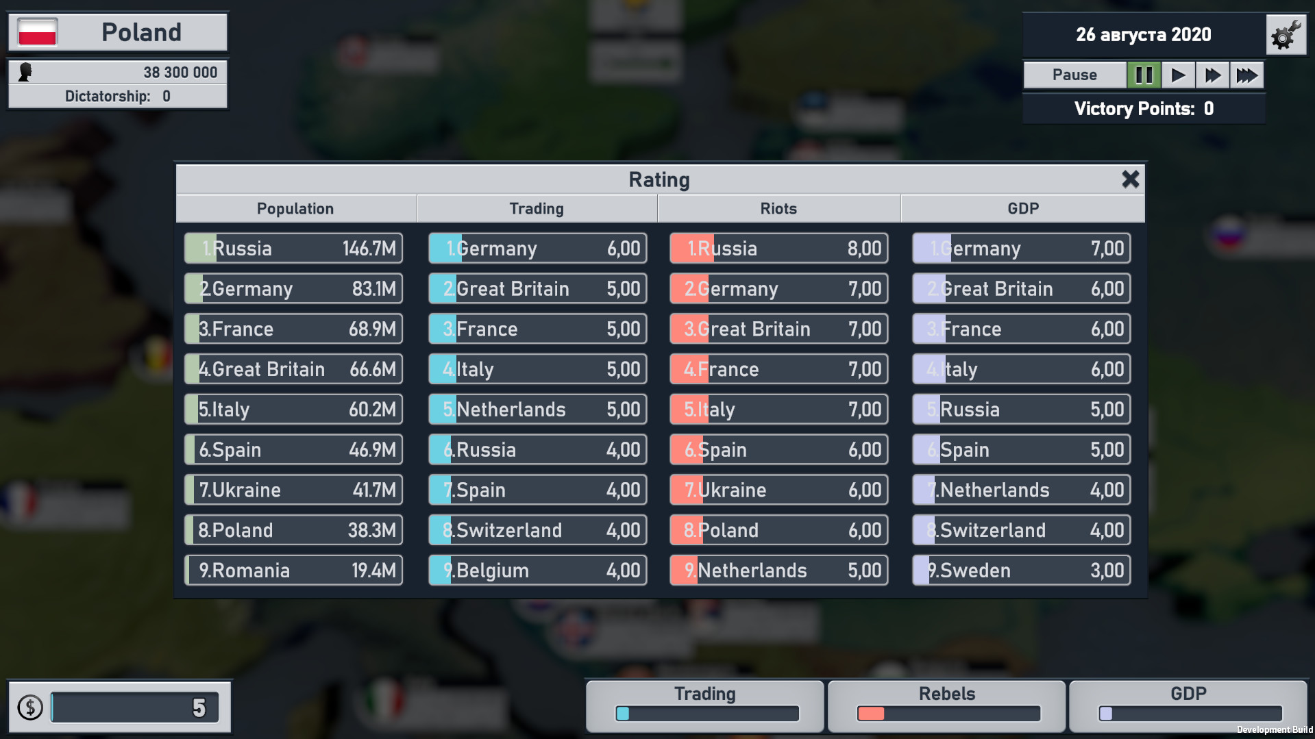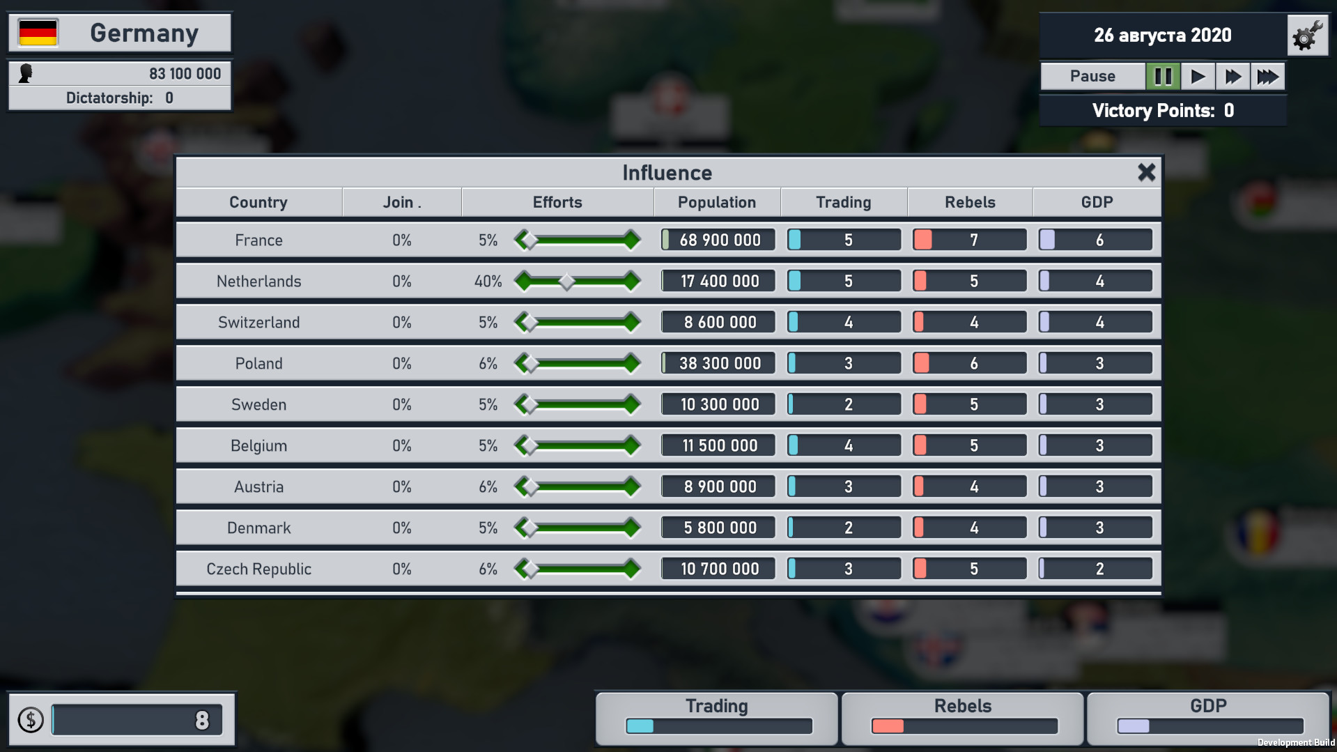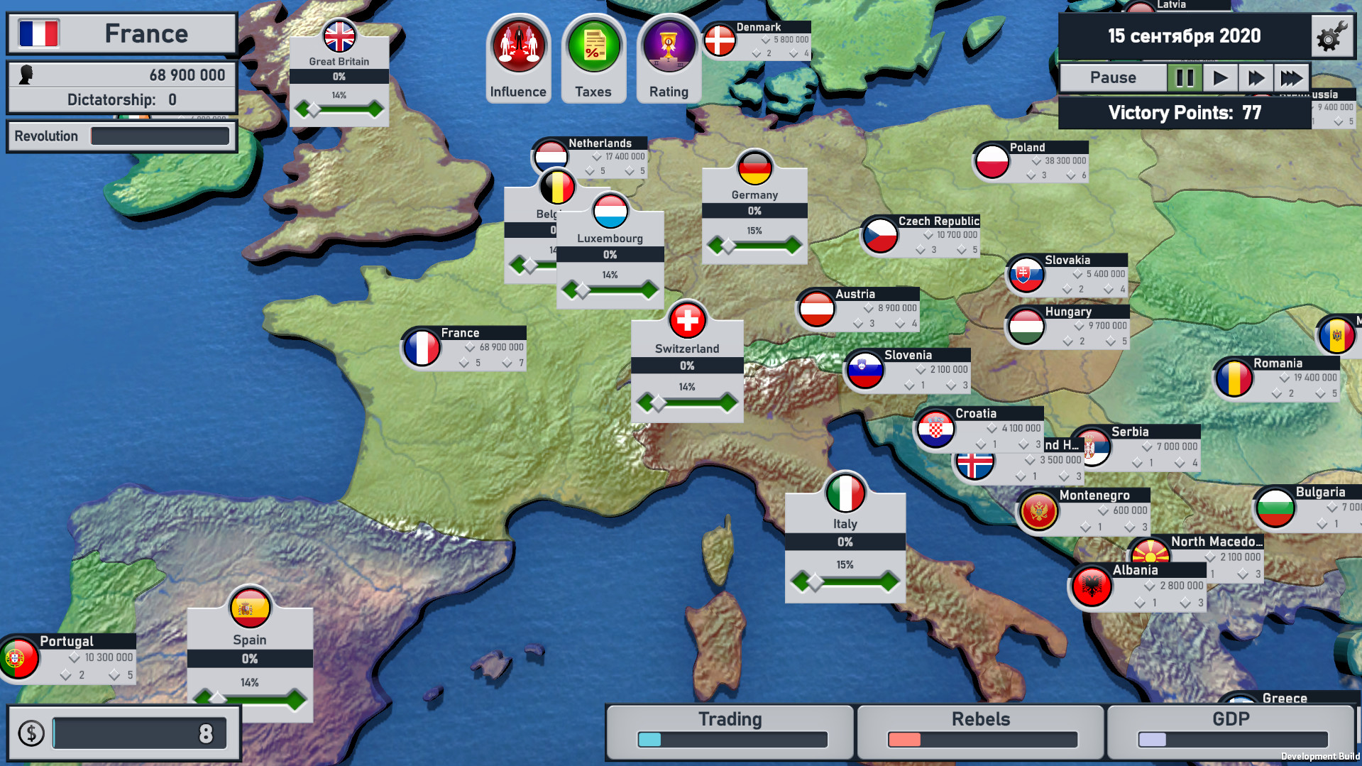Your goal is to create the biggest "corporation" - the European Union or one of the other Unions. Introduce duties and excise taxes, pass laws to grow your economy and trade, and join the neighboring countries. In addition, you have plenty of tools available to you to manage your domestic policies. You need to think ahead and take control of the "employees of the corporation" - let people not even think about protests.Hostile people say that we have a high-profile dictatorship? Let's be honest - they just envy us.