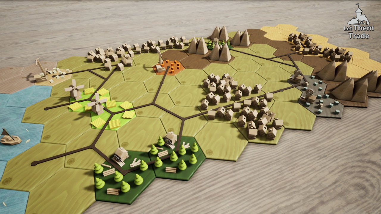 Let Them Trade is a minimalistic trading simulation in which you build a network of towns. What's particularly special about that is that this network is only used by AI-controlled merchants! So it is in your best interest to keep up the towns' supply and demand of their resources, and pocket a big part of the traders' coin - via tolls!