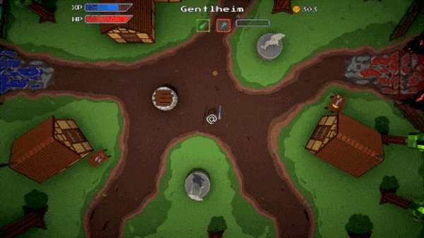 Gentlheim has Shops to buy and sell goods; an Inn to heal up, level up, and stash gold to retrieve after death; and a deep Well leading to randomly generated procedural levels. There are various structures you can pay to upgrade and, as language returns to the village, townsfolk who may need something... Gentlheim hides a few surprises for the inquisitive gamer and provides a hub area to approach different stages in any order you like, or revisit levels you’ve already beaten.