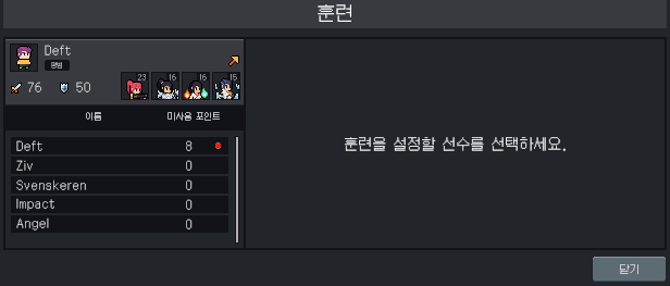 영입을 통해 더 좋은 선수를 찾거나 현재 보유한 선수를 육성해서 더욱 강한 팀을 만들 수 있습니다. 선수마다 공격/방어 능력치 및 챔피언 숙련도가 다르고, 어떤 선수는 특성을 통해 차별화되는 능력을 보유할 수도 있습니다. 팀의 자금과 선수의 능력을 잘 고려하여 효율적으로 선수를 관리해 보세요.