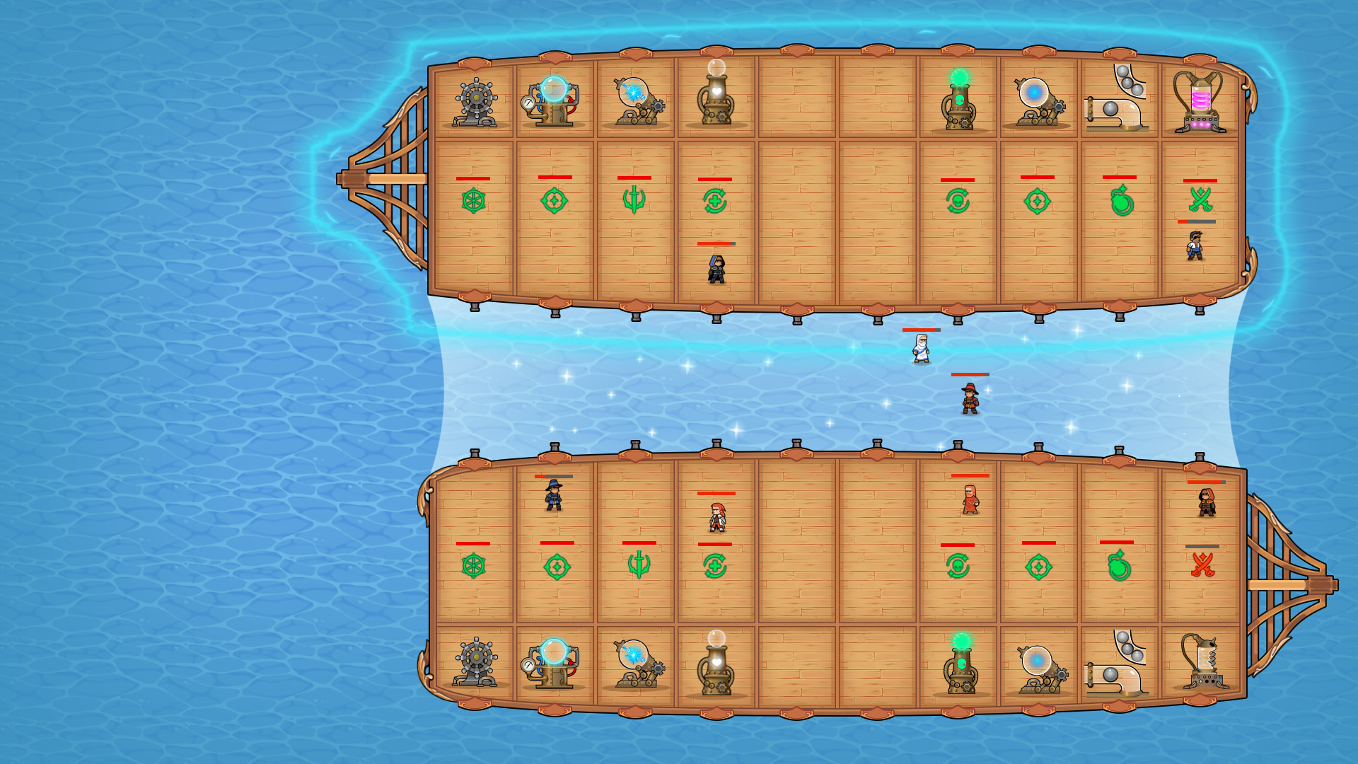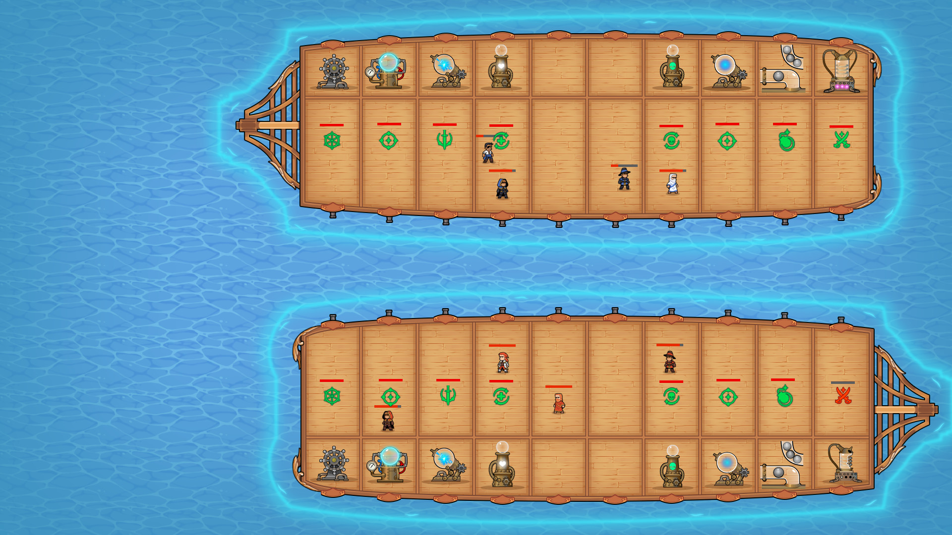 The game has a system of simultaneous orders (We Go), which implied that players simultaneously plan their actions and then observe the results. Because of this, the game is turn-based but isn't forcing you to wait for opponents for a long time, also, it encourages "mind games". For example, if you can guess where several of your opponent's characters move, you'll be able to "greet" them with a cannon shot at this cell. But your opponent also can guess that you will shot at this cell if this option becomes too obvious...