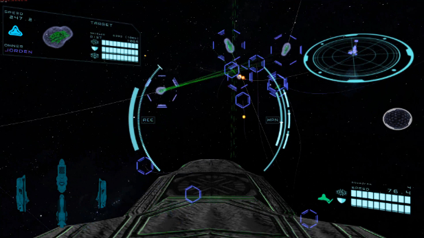Every part of every ship is individually damaged and destroyed. Penetrate the hull to damage the critical systems held within. Enough damage will see a ship fully perforated, allowing weapons fire to pass through one ship and into another. With careful shots enemy ships can be left disabled rather than destroyed, the better to salvage them and reverse engineer their technology.