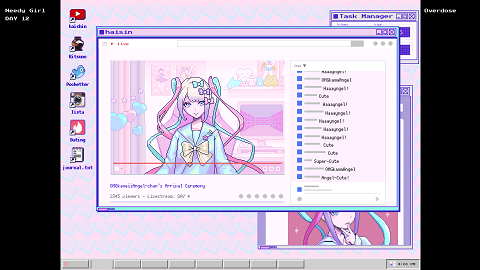 It’s not all about streaming – sometimes you just need to take a little break, too! Take Ame-chan on dates, serve her up a little bit of naughtiness once in awhile, provide her with a little something-something to take the edge off when she needs to release some pent-up stress, and use online dating apps to send her on dates with other dudes to help keep her happy and mentally healthy. *NOTE: This is actually a perfectly wholesome game, containing absolutely no explicit sexual references or expressions nor illegal substances.