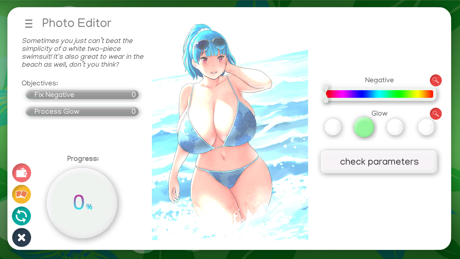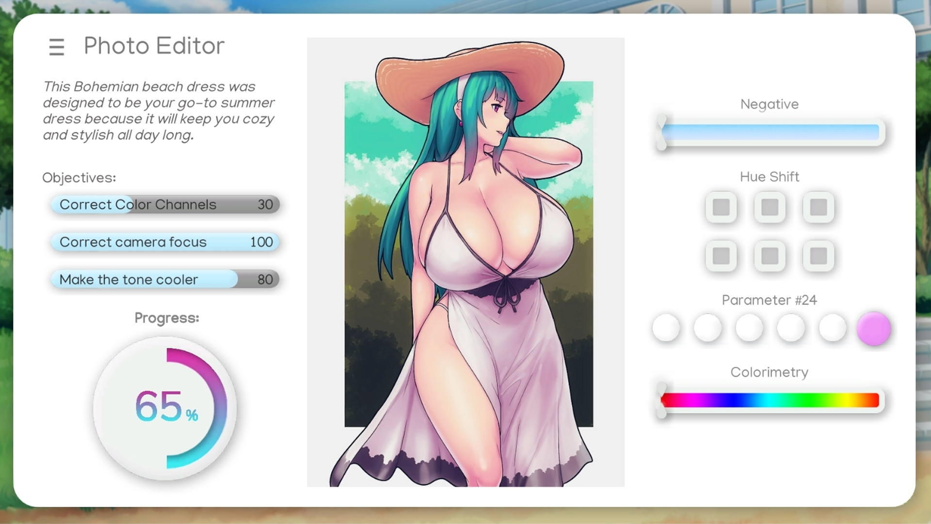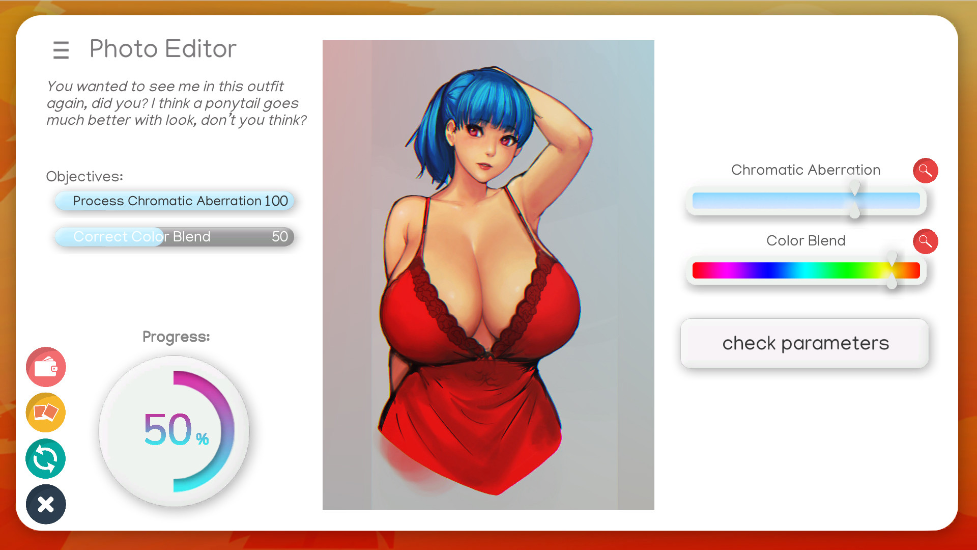 Every time you will start a level, a set of parameters will be applied to the pictures and used as elements to correct. The number of parameters and the precision requested will depend the difficulty (easy, medium, hard). If you replay a level, the parameters will be different. The game currently includes 20 different parameters to tweak the pictures.All arts by Erkaz!