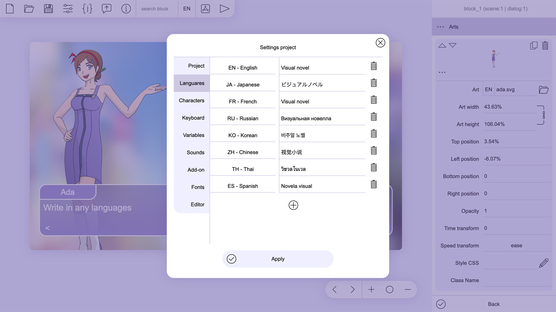 is a free open source engine to creating visual novels, interactive stories and text-based adventure games. Written in JavaScript without using any third party libraries. The projects can be exported to Apache Cordova to create mobile applications or PC programs. The engine uses standard HTML document elements DOM such as div and img, this allows the use any media format supported by browsers, including vector graphics svg, gif animations and css styles.