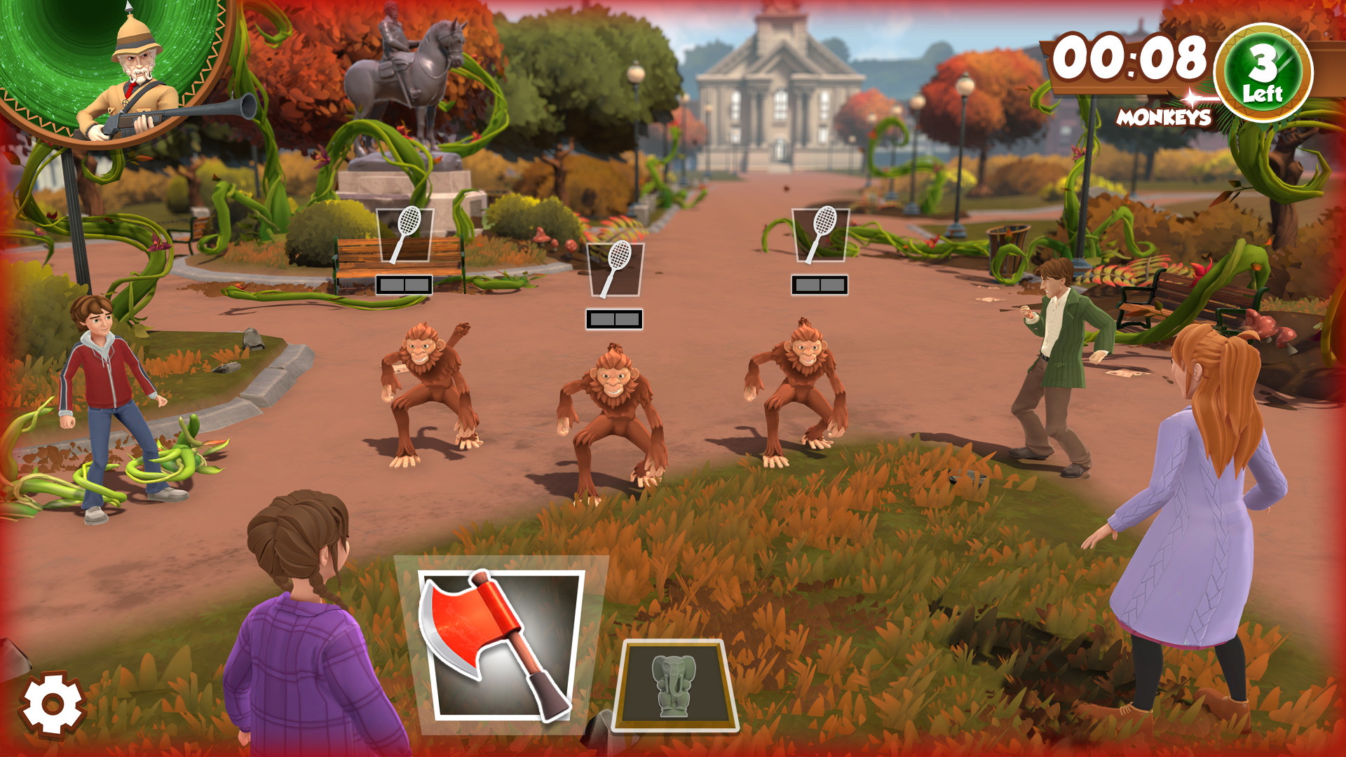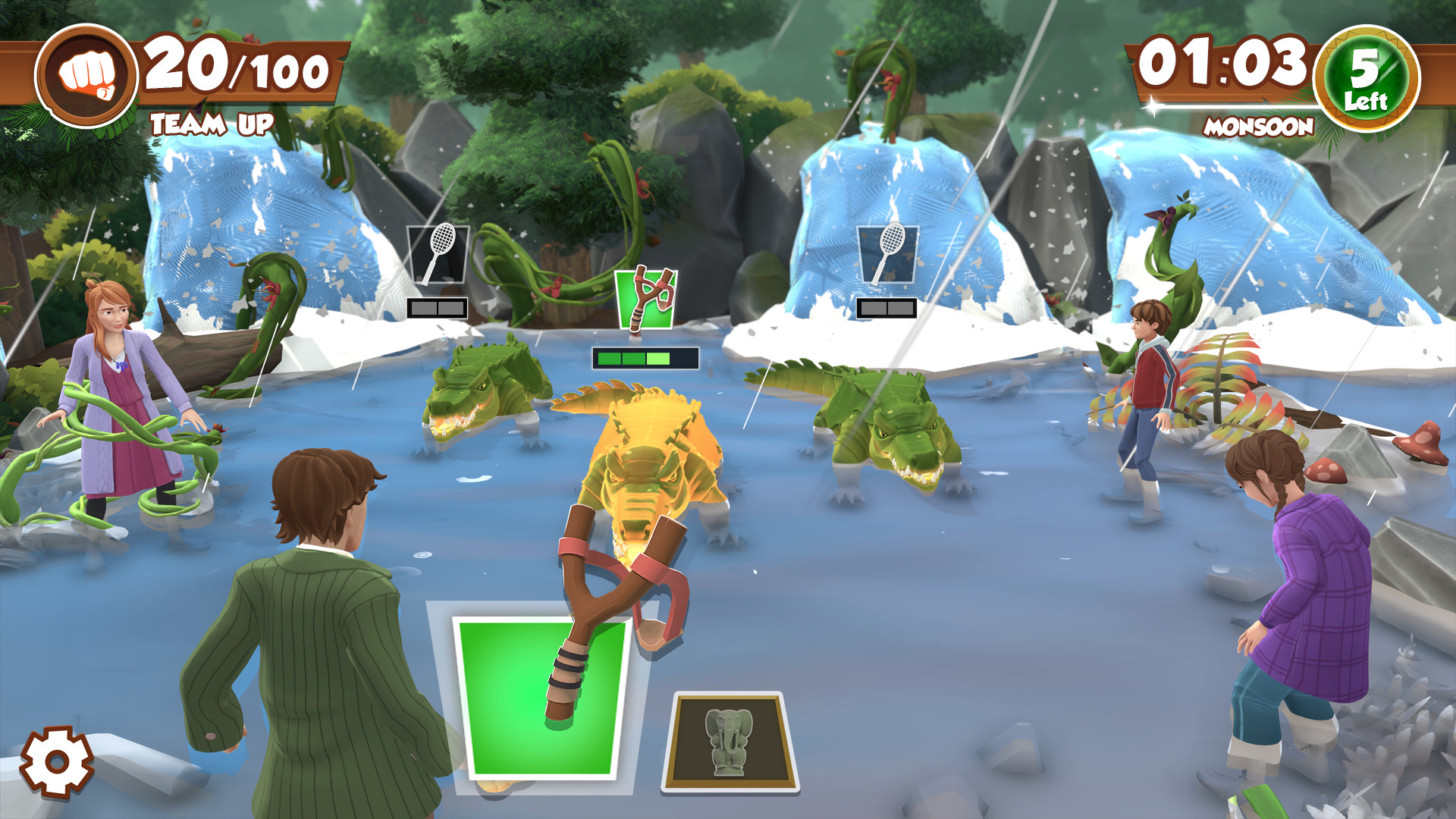 Your team will face more than one threat in every round. While you battle jungle creatures, twisting vines will try to ensnare you and your friends, and you’ll have to help each other to escape. If the board game releases the hunter, Van Pelt, you’ll also need to dodge his attacks! Work together to keep everyone in the game.