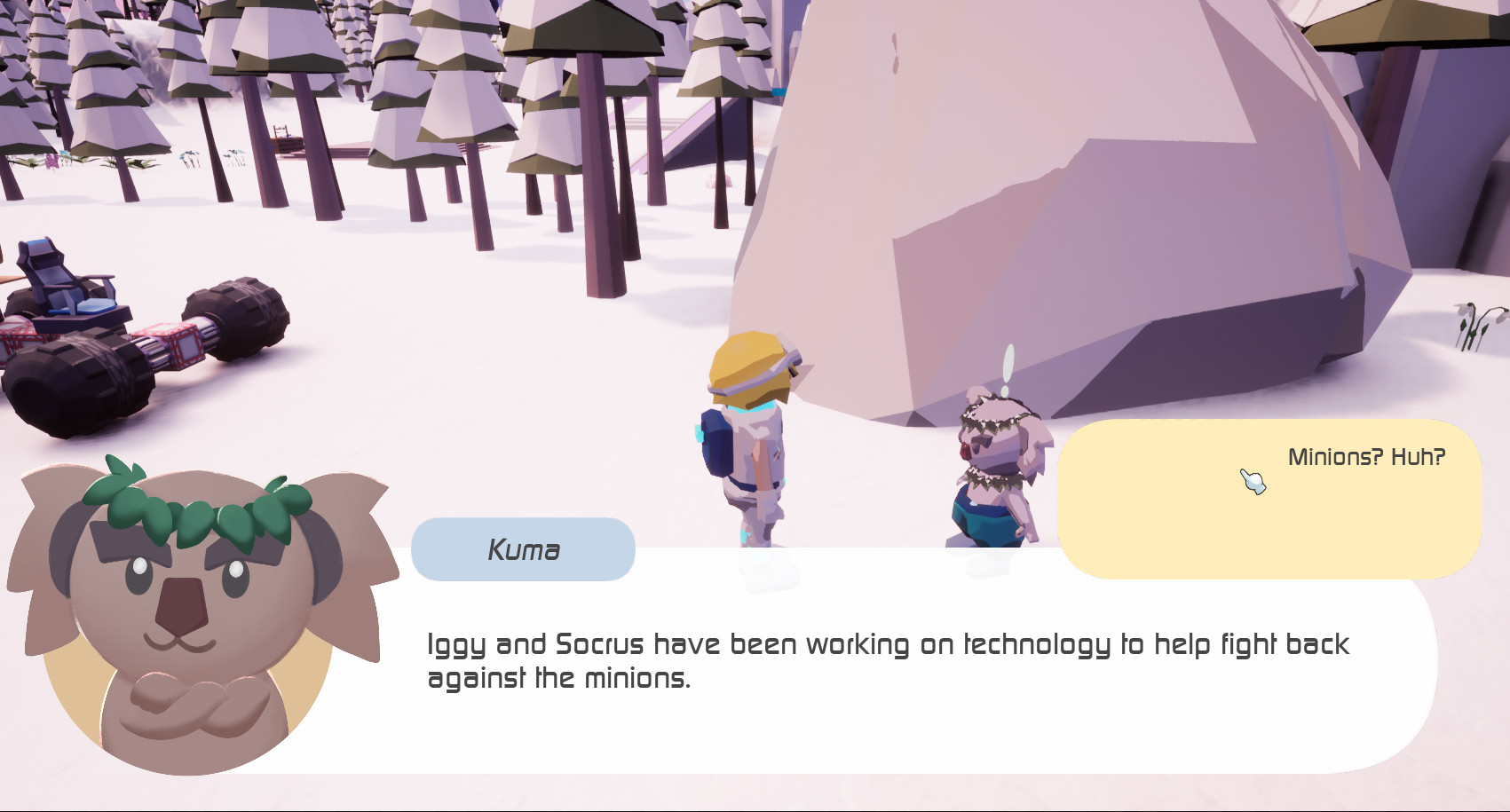 Explore the vast open-world with your build or on foot. Speak to the koalas, they may reveal secrets or give you quests. The quests are either puzzle or combat, but either way, you will be generously rewarded with new parts, weapons, and most importantly, the koalas trust!