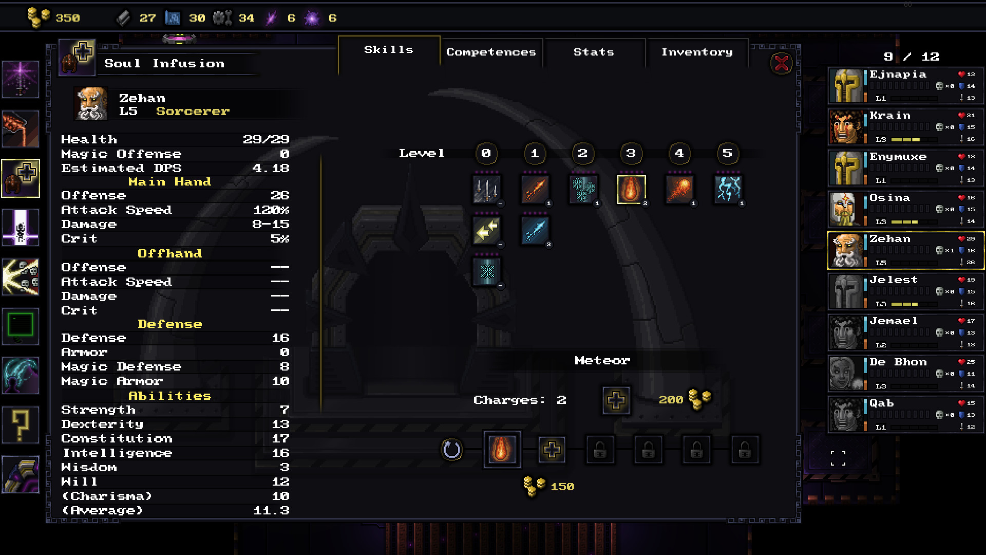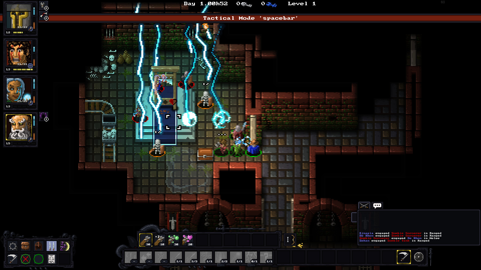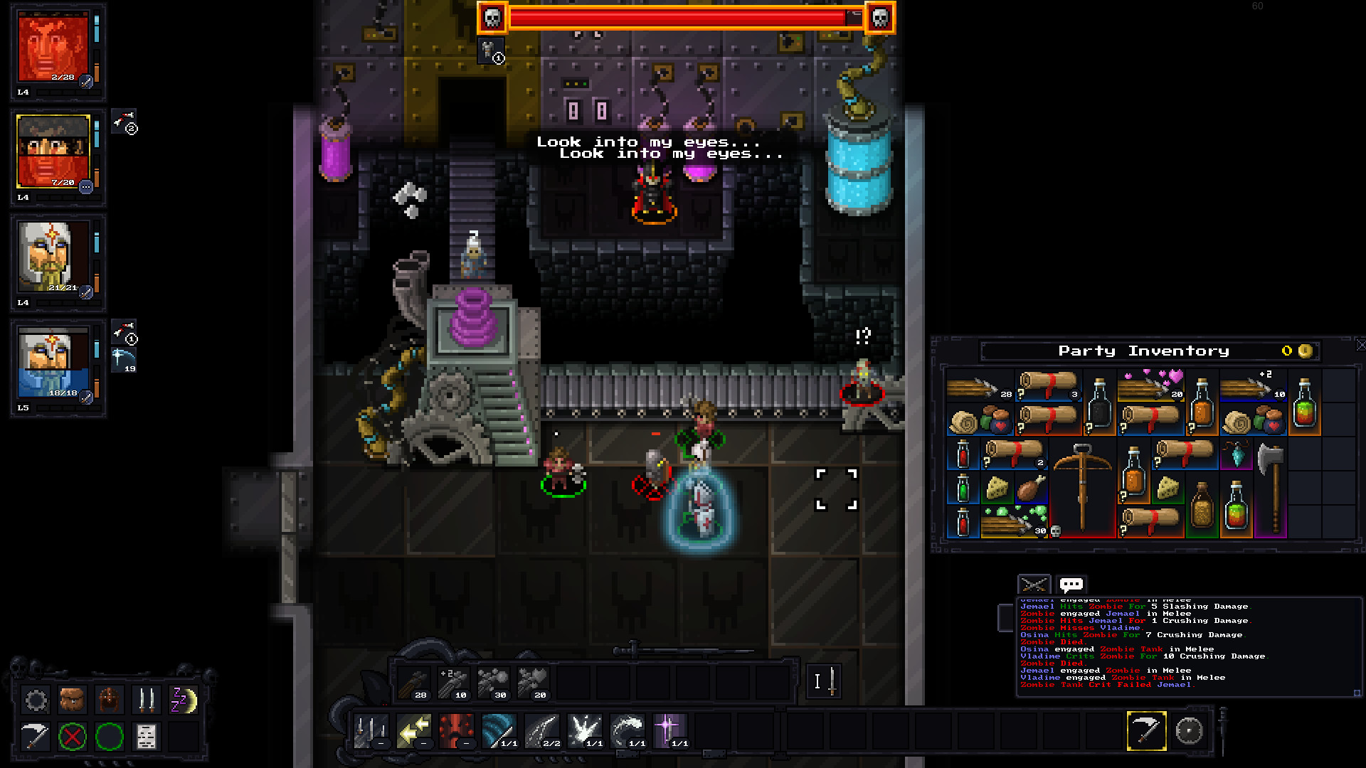 Over the course of a mission, manage your spell charges, hunger, thirst, health, injuries, instability and consumables (potions, scrolls, food, drinks, etc.). Will you dare to equip that potentially cursed unidentified item or use that powerful unidentified potion right away? Perhaps you should wait until you have more scrolls of identification? Well, half your party is unconscious on the ground, you have to make a choice! Maybe you'll sacrifice that legendary chicken to distract monsters as you run? You'll starve to death but at least you'll live another day...