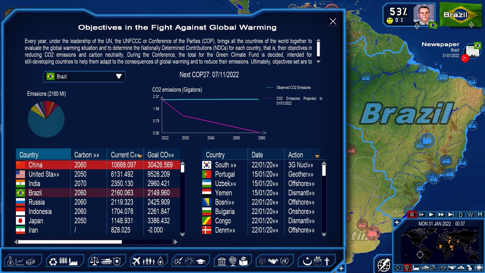 With the simulation of the Climate Change Conferences (COP), it will be possible to modify goals for the reduction of CO2, participate in deciding on the Green Climate Fund, intended to help developing countries, and most of all, influence other countries to do more in their efforts with an AI system setting the objectives to reach for all countries and the actions and legislation to implement. Finally, the player will be able to follow the global warming trends in a precise and detailed manner up to the year 2100.