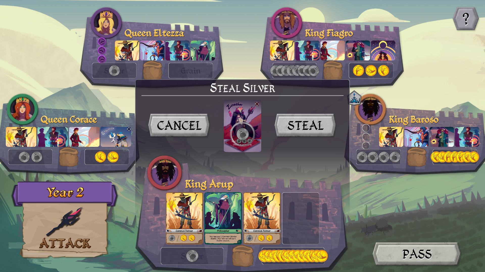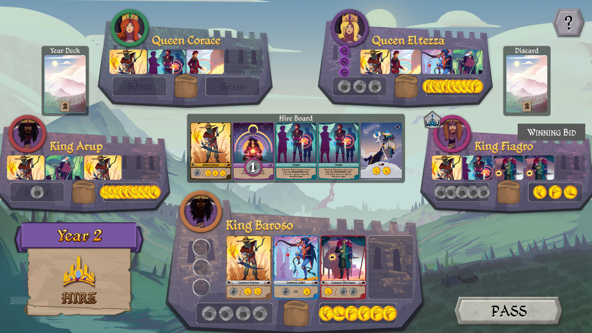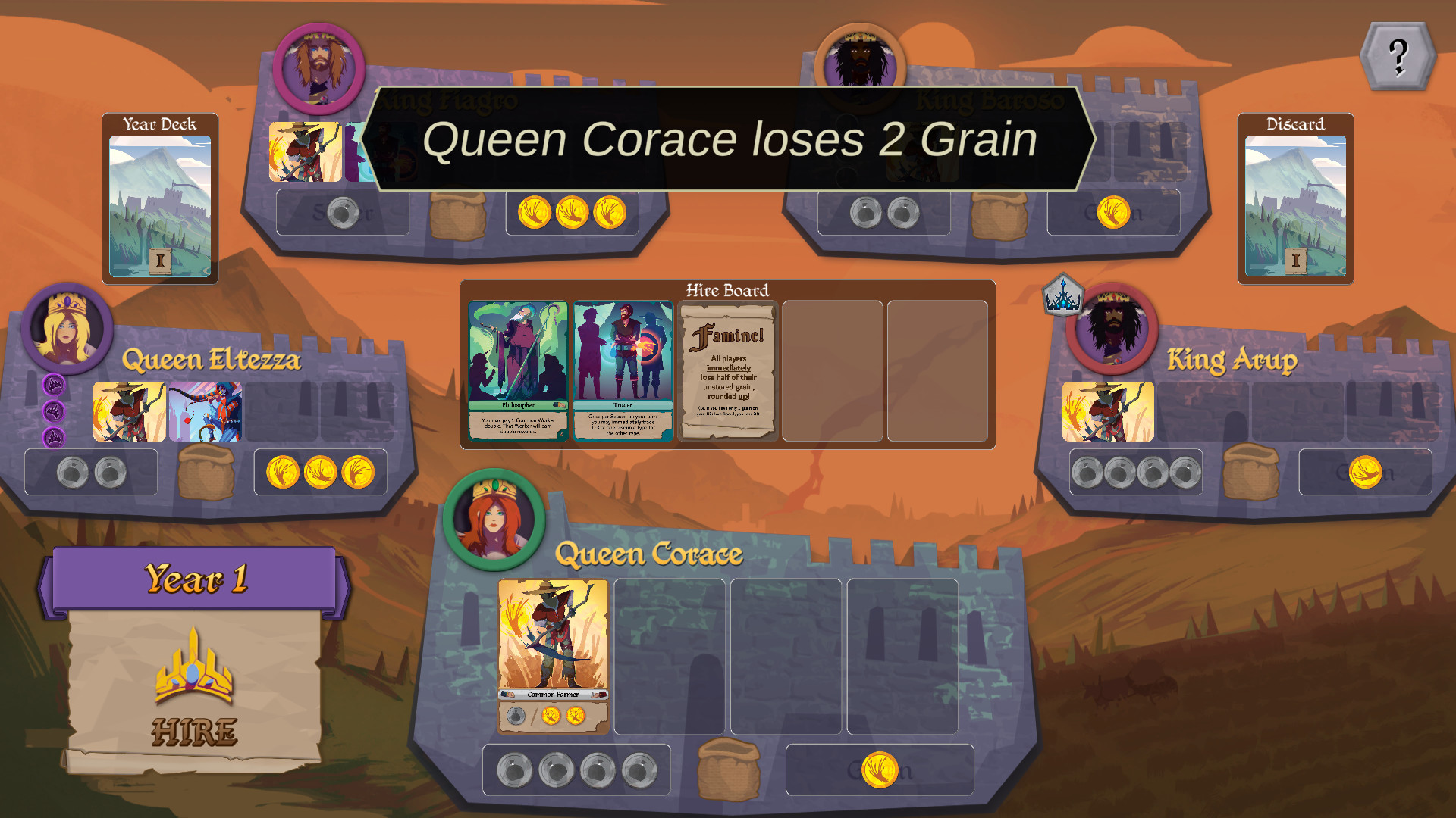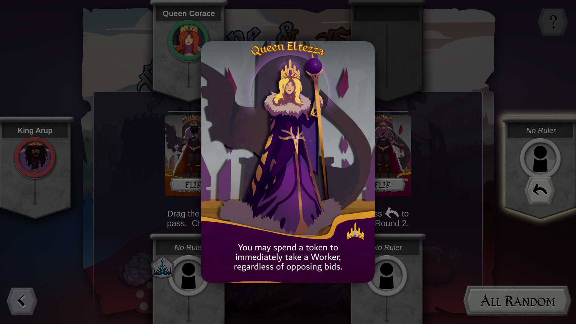 The digital version plays like the tabletop version of Fortune & Famine, but with digital cards and tokens. You begin by selecting a First Player, then choosing from 1 of 6 Rulers, each with a unique ability.