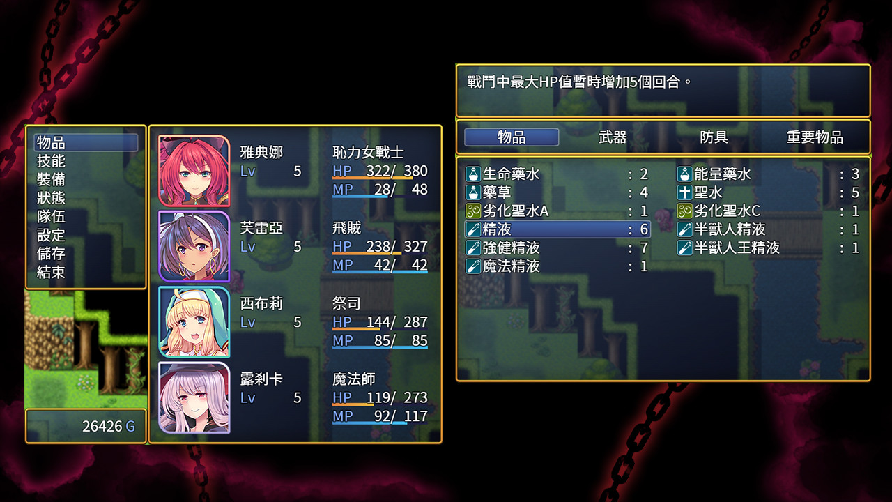 ・在戰鬥中不小心中毒可就糟了,每回合都會扣HP,這可嚴重影響戰鬥啊!可是買不起昂貴的解毒草該怎麼辦?聽說積聚的毒素可經小穴排出體外,中毒後只要立即高潮,噴射出來的淫水就可以把毒素沖出來。可是,人家正在戰鬥呢,究竟怎樣才能快速的達至高潮?