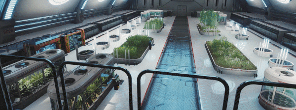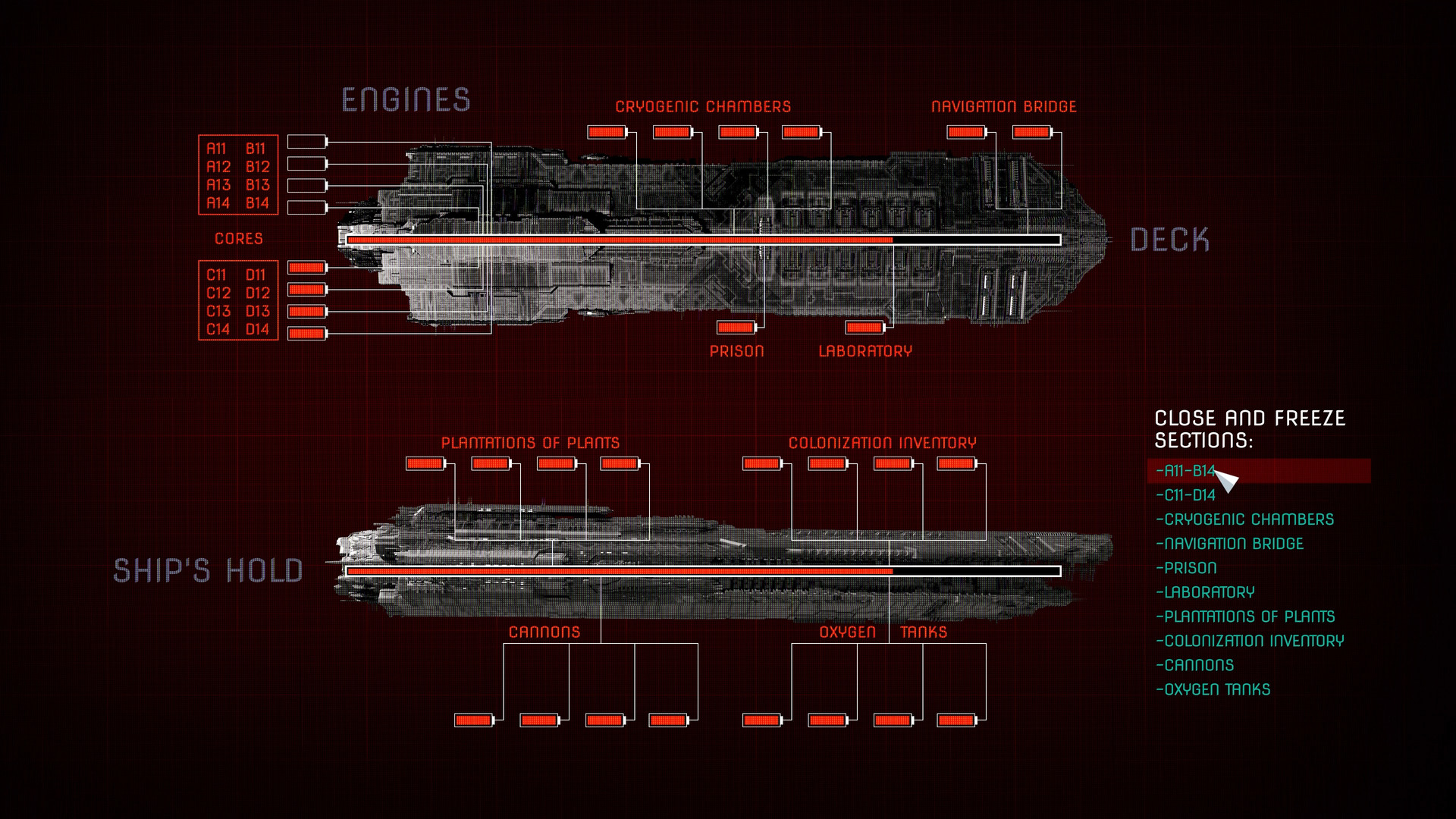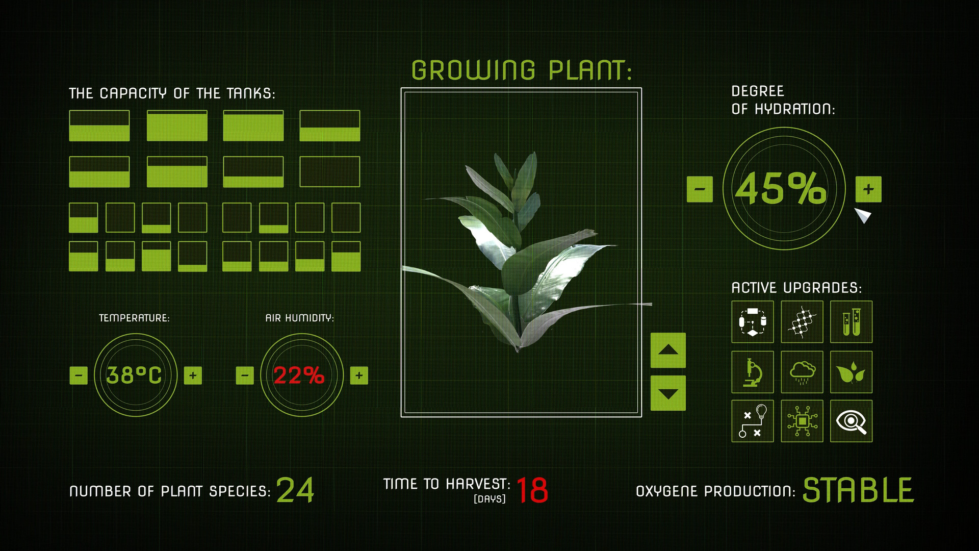 The colony ship is self-contained. Oxygen and additional food are supplied by plants, and it is your responsibility to provide suitable climatic conditions for plant growth. Control parameters such as air humidity, temperature, and hydration level.