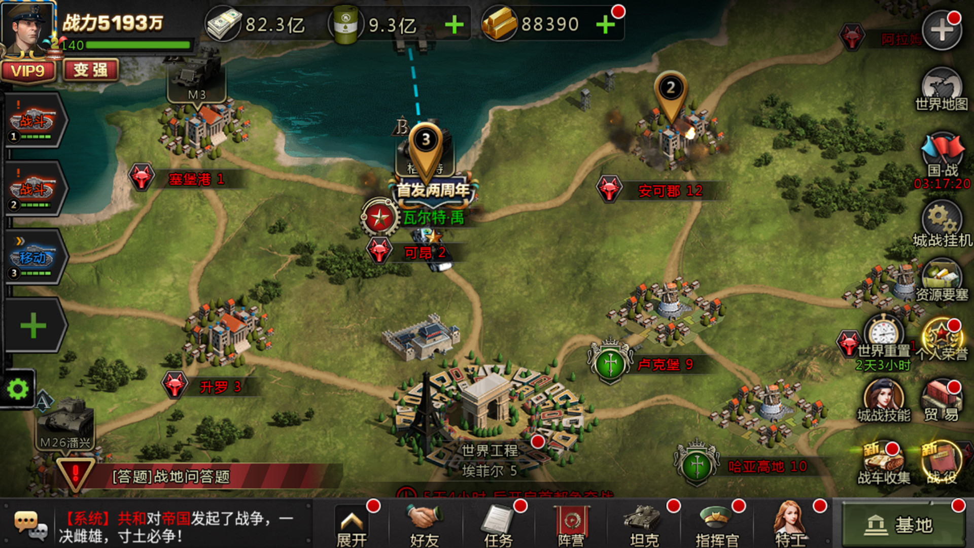 每天中午12点和晚上的20点都会开启国战任务,根据占领城市的多少计算积分,积分越高获得的奖励越高,主