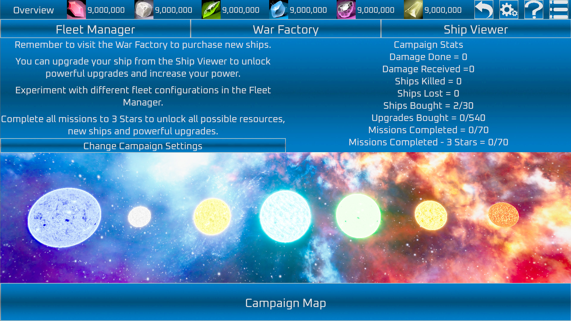 Utilize the Fleet Manager to customize your fleet with hundreds of formation combinations. War Factory to purchase new ships and sell no longer used ships. Ship Viewer to upgrade your ships with over ship specific upgrades.