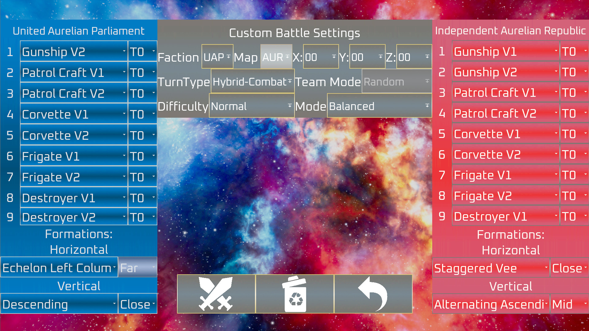Includes a custom battle mode to configure user created battles with full customization of a fleet battle simulator. Enjoy a vast variety of configurations to create your own 9v9 battle simulation. Chose from 19 different battle deployment settings that include: Random, Head-2-Head, Chase/Chased, Back-2-Back, 2x Parallels, 4x Flanks, 8x Obliques with advantageous and disadvantaged positions.