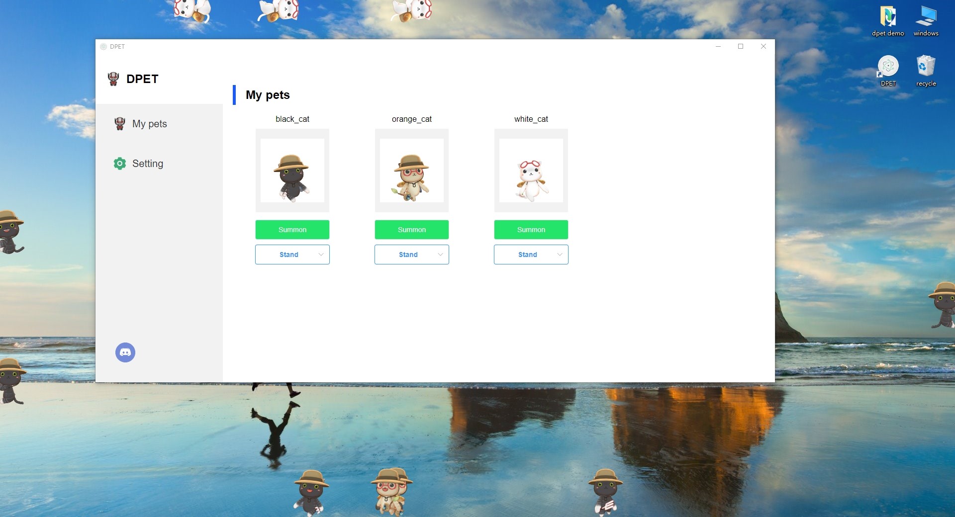 DPET is a desktop pet generation engine. In the client software, a lot of cute virtual pets are integrated, and you can summon them to your desktop with one click. Every pet can freely walk, run, climb on the desktop, and even self-clone itself into more partners.