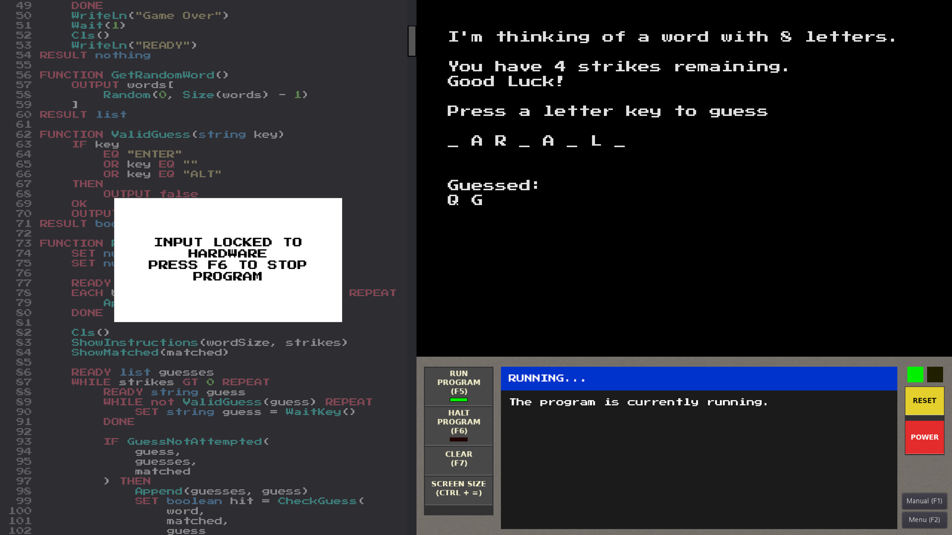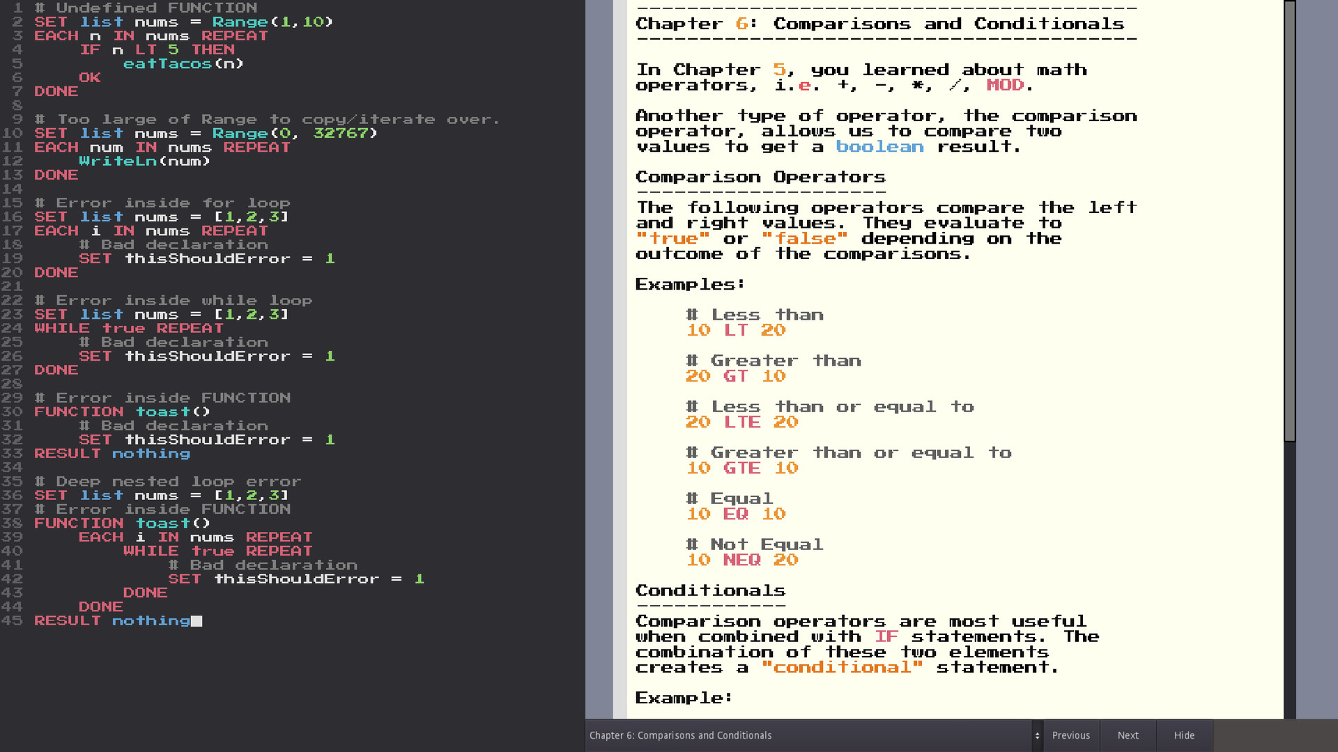 - Read the in-game manual to learn the language, discover system settings, and copy code examples to run in the editor.
