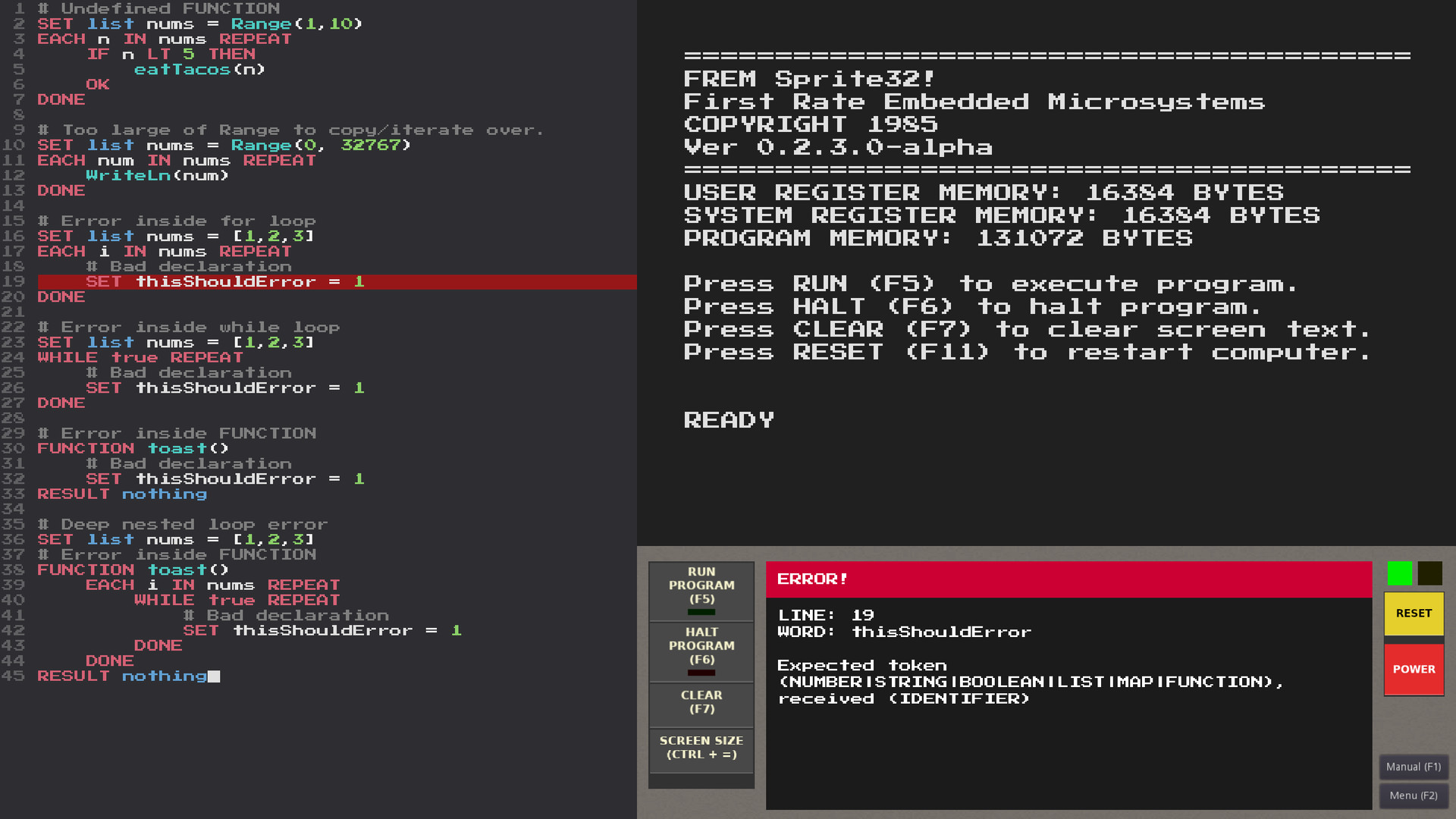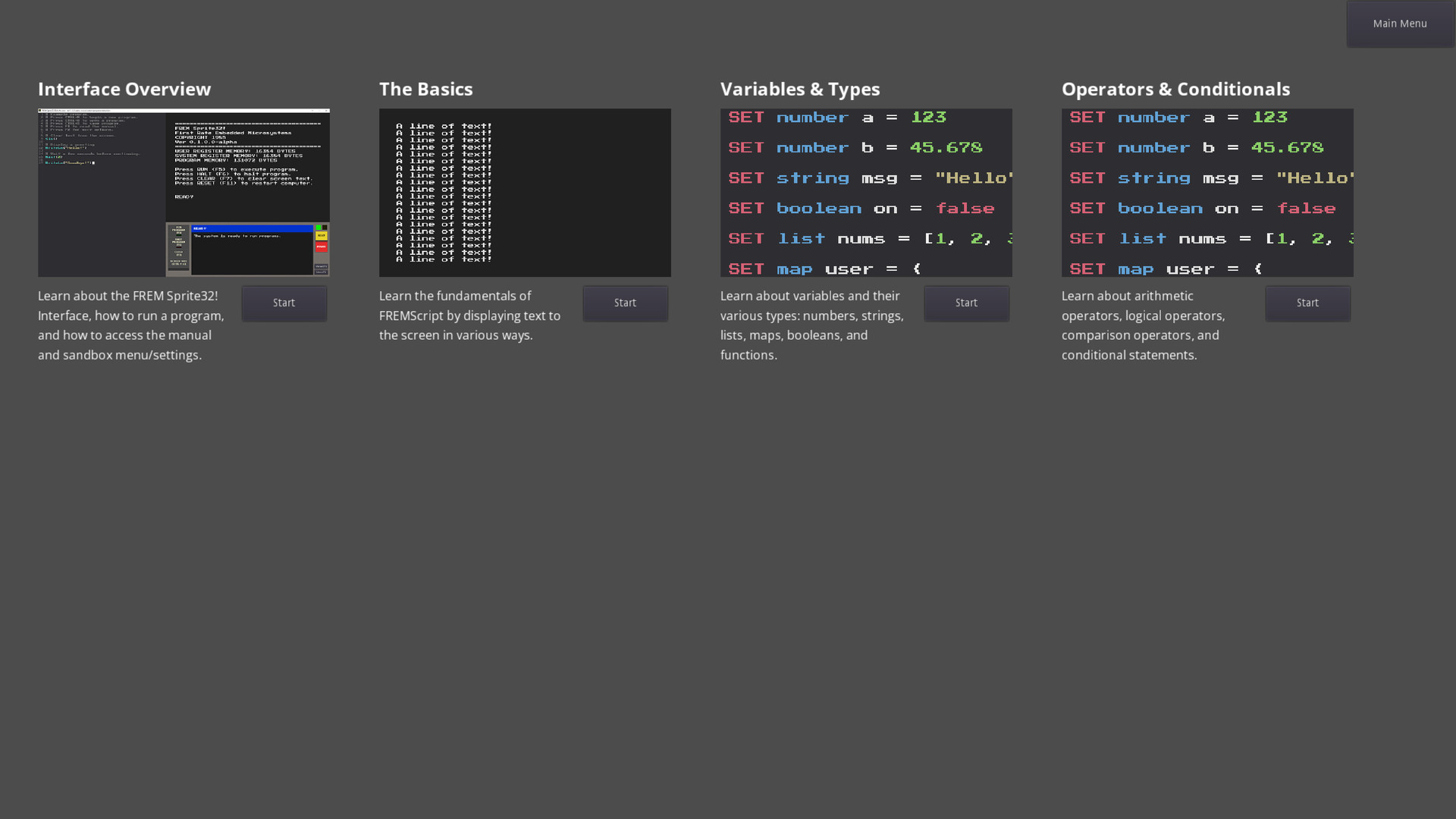 Play, learn, and experiment with programming in the Sprite32! 8-bit microcomputer sandbox. Use the high-level FREMScript programming language to write programs, create dynamic pixel art, and explore audio generation. Play tutorials and scenarios to learn all the aspects of the system. Take a trip back in time to the early days of home computing with the Sprite32!’s 320x200 pixel display, 40 columns of text, 8 bit memory limitations, and 80s-era CPU speeds.