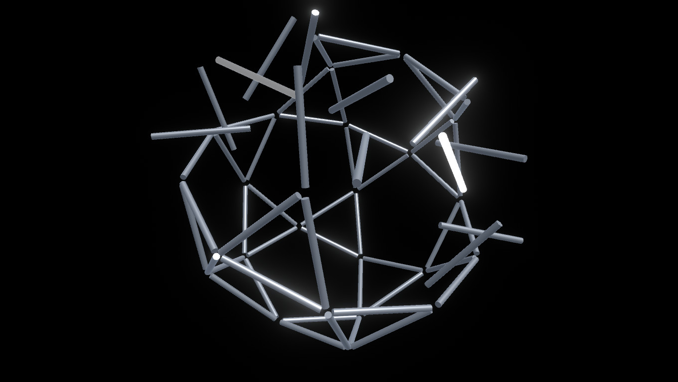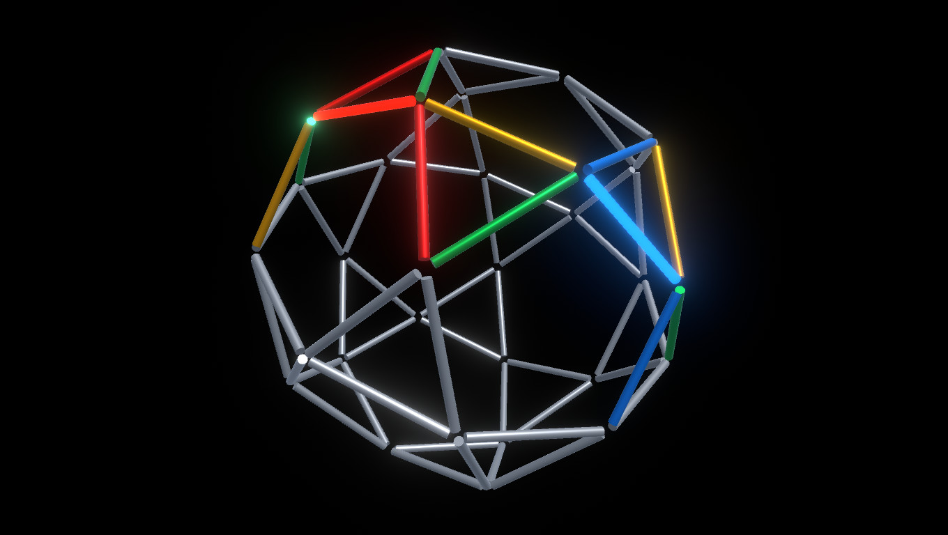 This single-player minimalist puzzle game is as much a game of logic as it is of patience. The objective of each puzzle is to swap pairs of colored rods such that all four rods that meet in any of 30 corners have different colors - a problem known as "edge coloring" in mathematics. The catch is to solve each puzzle with a limited number of swaps (unless you deactivate that limit).