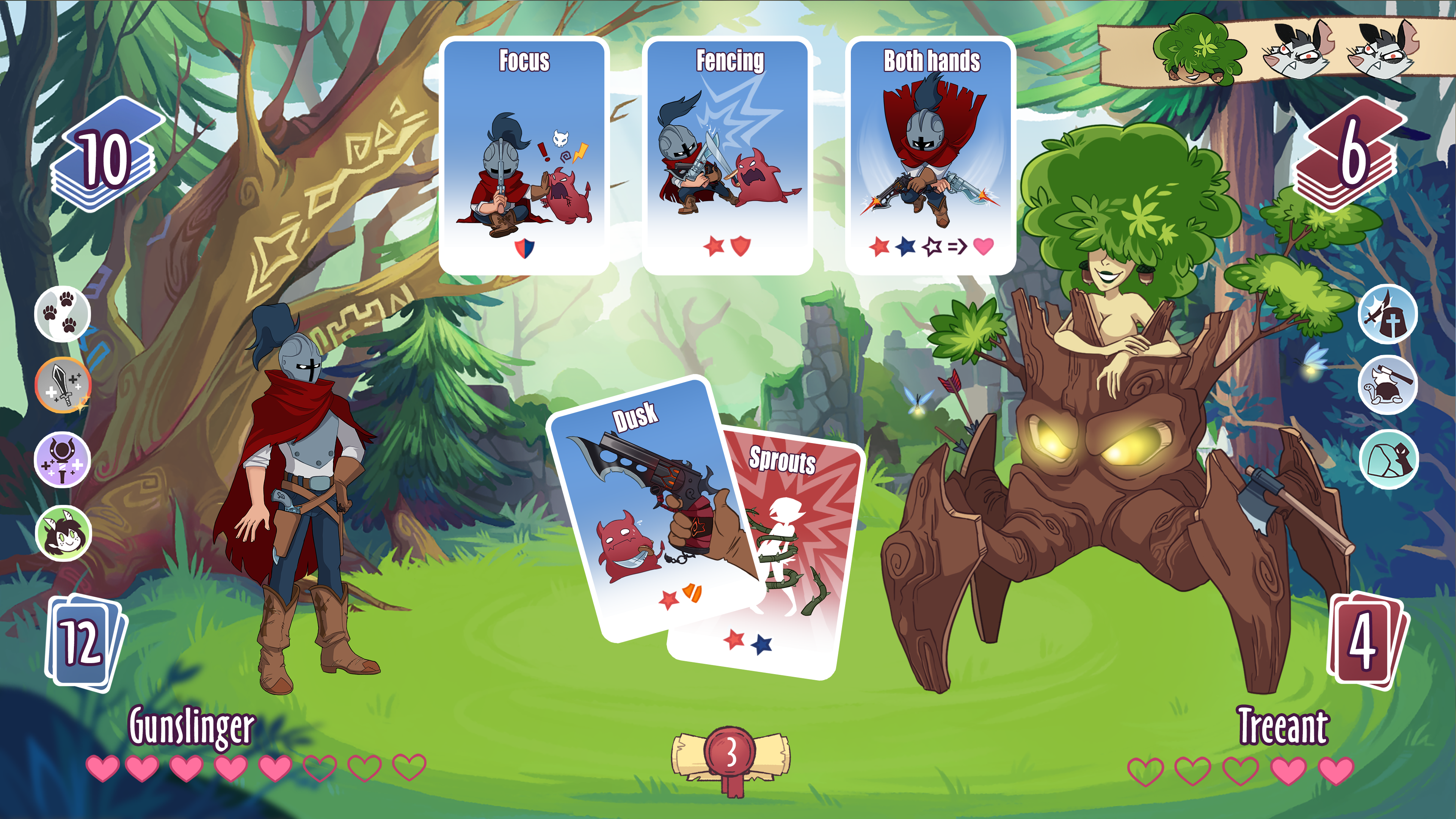 The mob goes first, playing the top card from its deck. Then, the player selects one card from his hand in order to respond to the attack as effectively as possible. However, it is worth taking into account not only the current situation, but also the cards that remain in the enemy's deck.