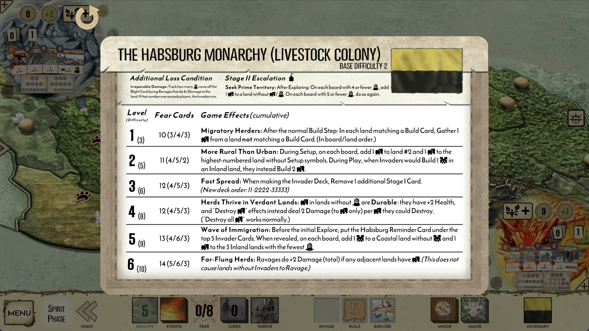 Play Option - Extra Island Board: You can now include an extra board to defend, with no Spirit starting on it. This provides a different sort of Difficulty boost from Adversaries or Scenarios. The higher Difficulty the game already is, the more Difficulty another board will add.