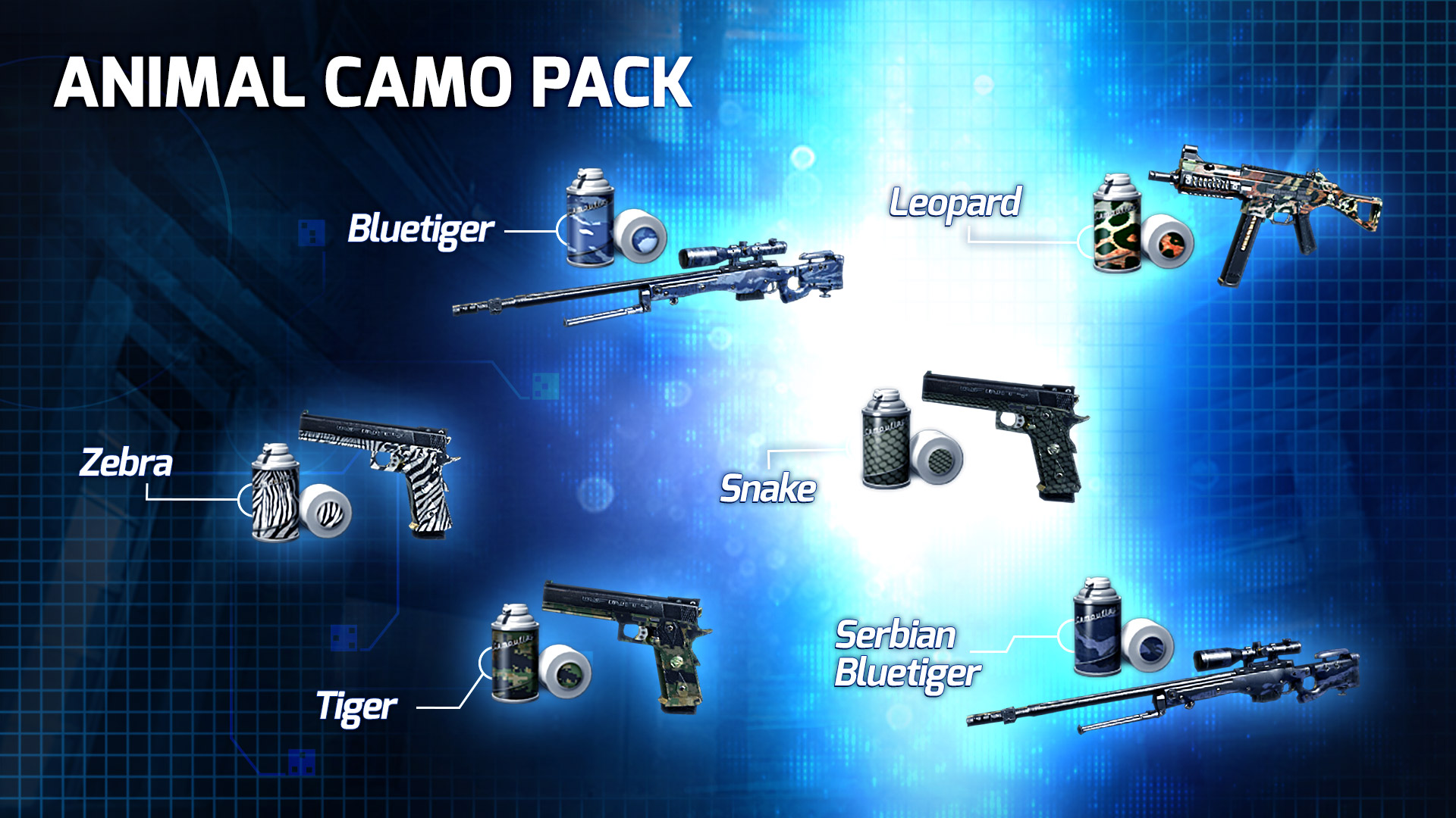 This pack contains 6 camo sprays, each usable for 30 days. These include the camo sprays 'Zebra' and 'Tiger', for example, which give your weapons a real wild look!