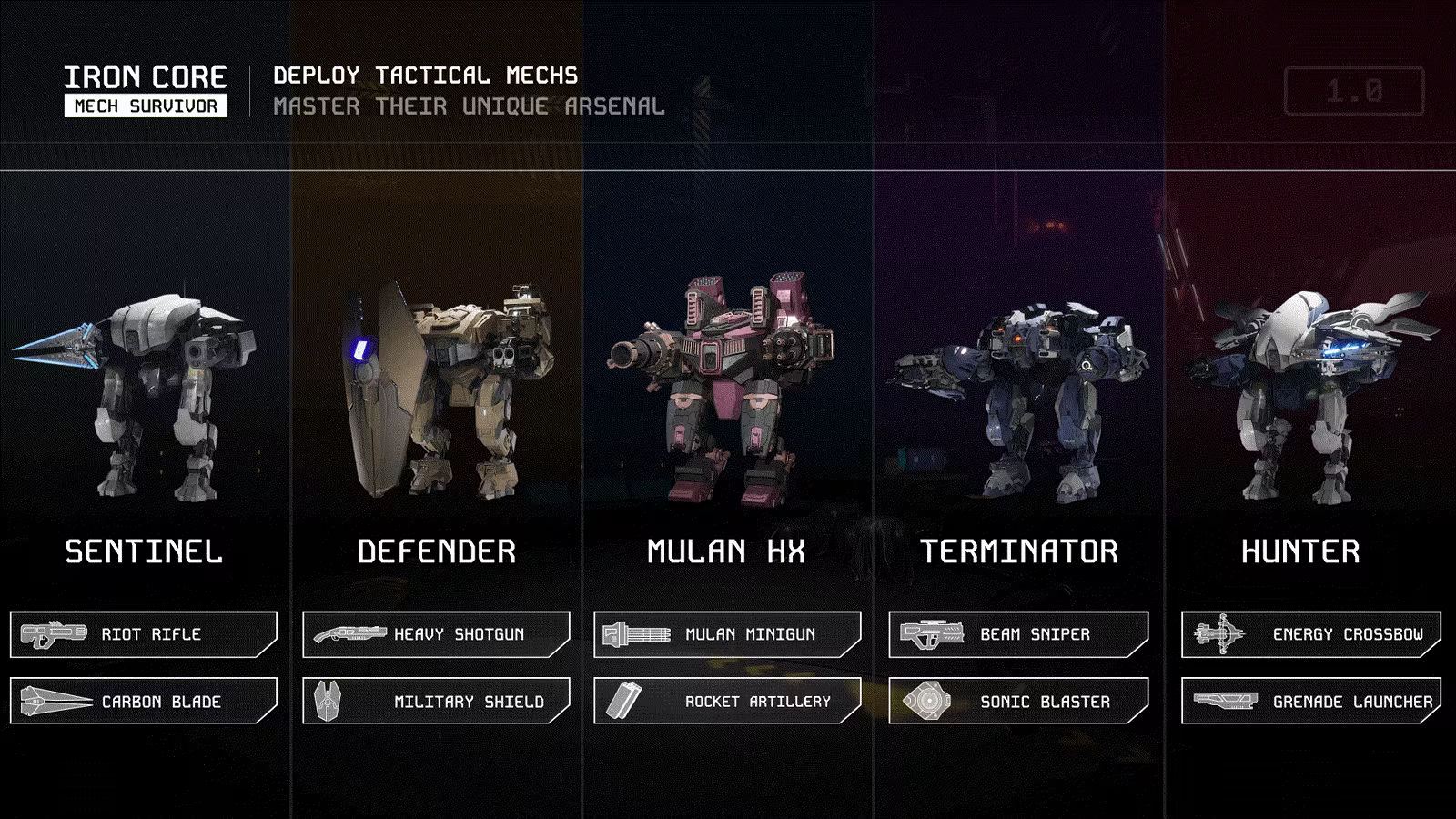 Iron Core: Mech Survivor는 배틀 로얄의 축소되는 안전 지대, 타워 디펜스의 전략적 요소, 서바이버류 게임의 빠른 게임플레이를 결합한 싱글플레이어 로그라이크 탑다운 액션 게임입니다. 축소되는 안전 지대는 플레이어의 이동을 제한하지만 채굴 임무를 통해 확장할 수 있습니다. 반면 안전 지대 바깥에는 더 많은 자원이 있어 로그라이크와 서바이버 게임 팬들에게 신선하고 스릴 넘치는 경험을 제공하는 고위험 고수익 시스템을 구현했습니다.