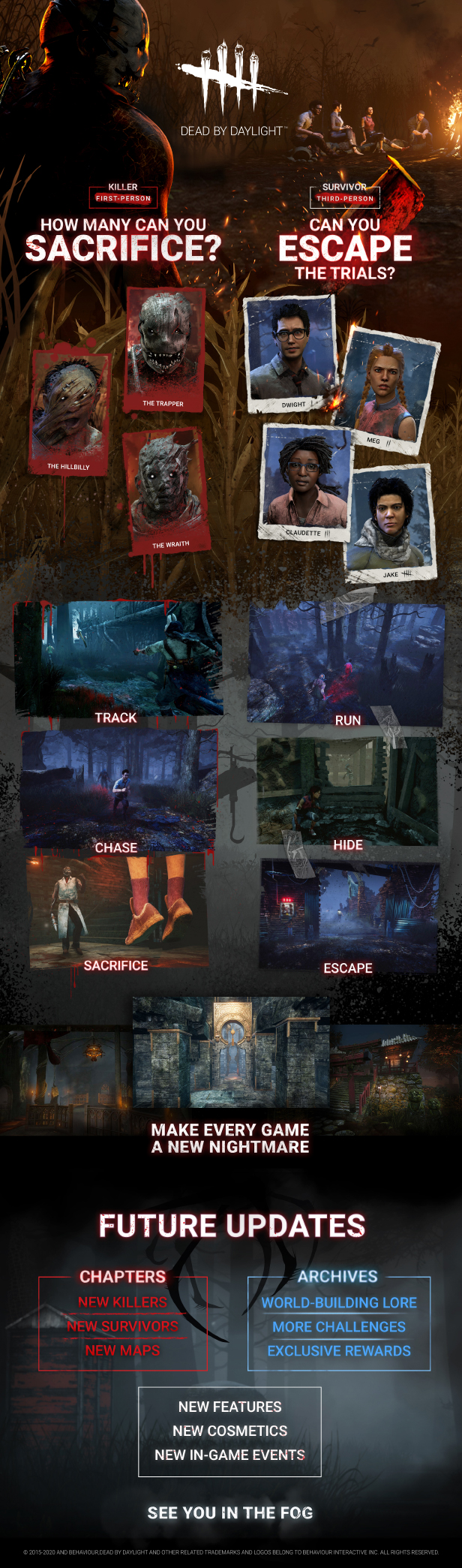 • 더욱 더 깊숙하게 – 각 살인마와 생존자는 당신의 전략에 맞춰 사용할 수 있도록 차별화된 능력들을 가지고 있습니다. 생존자들을 사냥하거나 살인마로부터 도망칠 수 있도록 경험과 기술, 환경에 대한 이해를 쌓아야 합니다.
