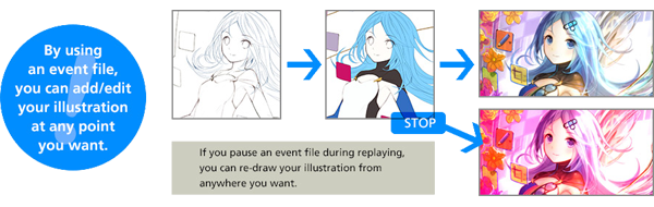 The greatest feature of GraphicEditor openCanvas is the Event function that enables you to record/replay the drawing procedure. By using this function, it shows the drawing procedure, that you have never been able to watch, via openCanvas software or the PGN community website.