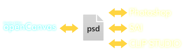 openCanvas supports saving as the PSD(Photoshop) format. You can open the openCanvas file in other software such as Adobe Photoshop, SAI, CLIP STUDIO PAINT, etc. while keeping most of layer information and layer modes. (※)