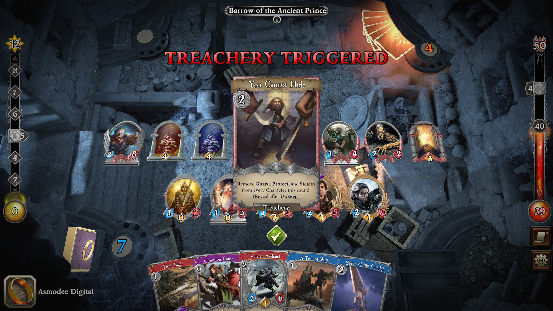 While your journeys may contain great challenges, taking advantage of your heroes and decks will earn you victory in battle. Sometimes combining the strength of multiple champions from the same Sphere of Influence to increase its power can help you overcome the swarms of enemies that you will face. You might need to rely on your heroes’ Willpower to increase your Fate Pool and trigger powerful abilities that can turn the tide of battle. There are many ways to win, you must find the deck and strategy that works for your fellowship!
