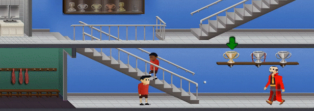 The combination to the safe consists of four letters, each master knowing one letter and the Headmaster's letter always coming first. To get hold of the combination, you first have to hit all the shields hanging on the school walls. Trouble is, this isn't as easy as it looks. Some of them can be hit by jumping up. Others are more difficult. You could try and hit a shield by bouncing a pellet off a master's head whilst he is sitting on the ground. Or, being Eric, you may decide to knock over one of the boys and, whilst he's flattened, clamber up on him so that you can jump higher.