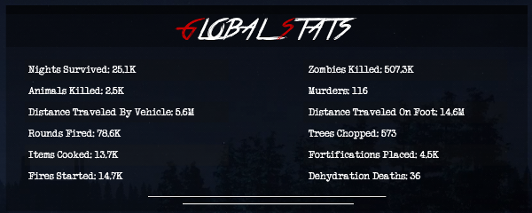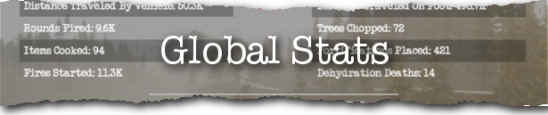 Server based leader boards allow you to see who has survived the longest on the server. Each player will also have personal stats seen via the main menu. The game also tracks global stats, seen on our website/forum and discord server.