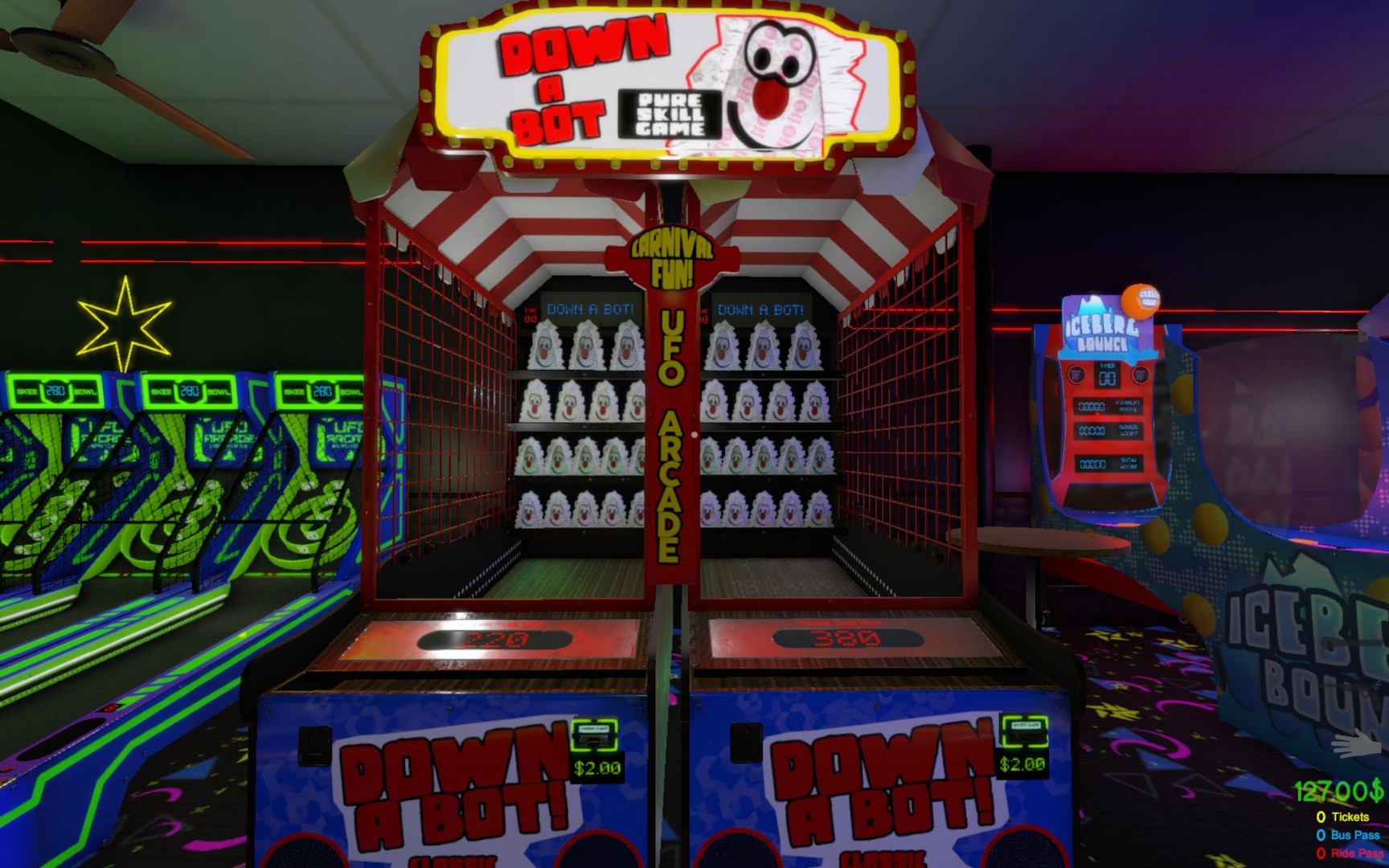 The Coin Game is a fun collection of ticket arcades that are all run by goofy robots on an little island full of things to do. The arcades include highly detailed machines with realistic physics that are inspired by modern arcade machines. There are ticket redemption areas to exchange your counted tickets for all kinds of fun prizes. Larry's Arcade has an in-house animatronic band called Teddy and the Ticket Eaters that would love to play you some tunes while you enjoy the arcade. The most recent addition to Islandville island, UFO Arcade features modern space inspired arcade machines, Lazer Tag and an Indoor Go Kart Race Track. Make sure to watch out for the minions, they really love Teddy and his band and they also are pretty good at Lazer Tag. Run out of money? That's ok. You can work odd jobs around the island to get back on your feet. Got extra prizes? The island has a Pawn Shop that will buy your used prizes for cash so you can go blow it back at the arcade.