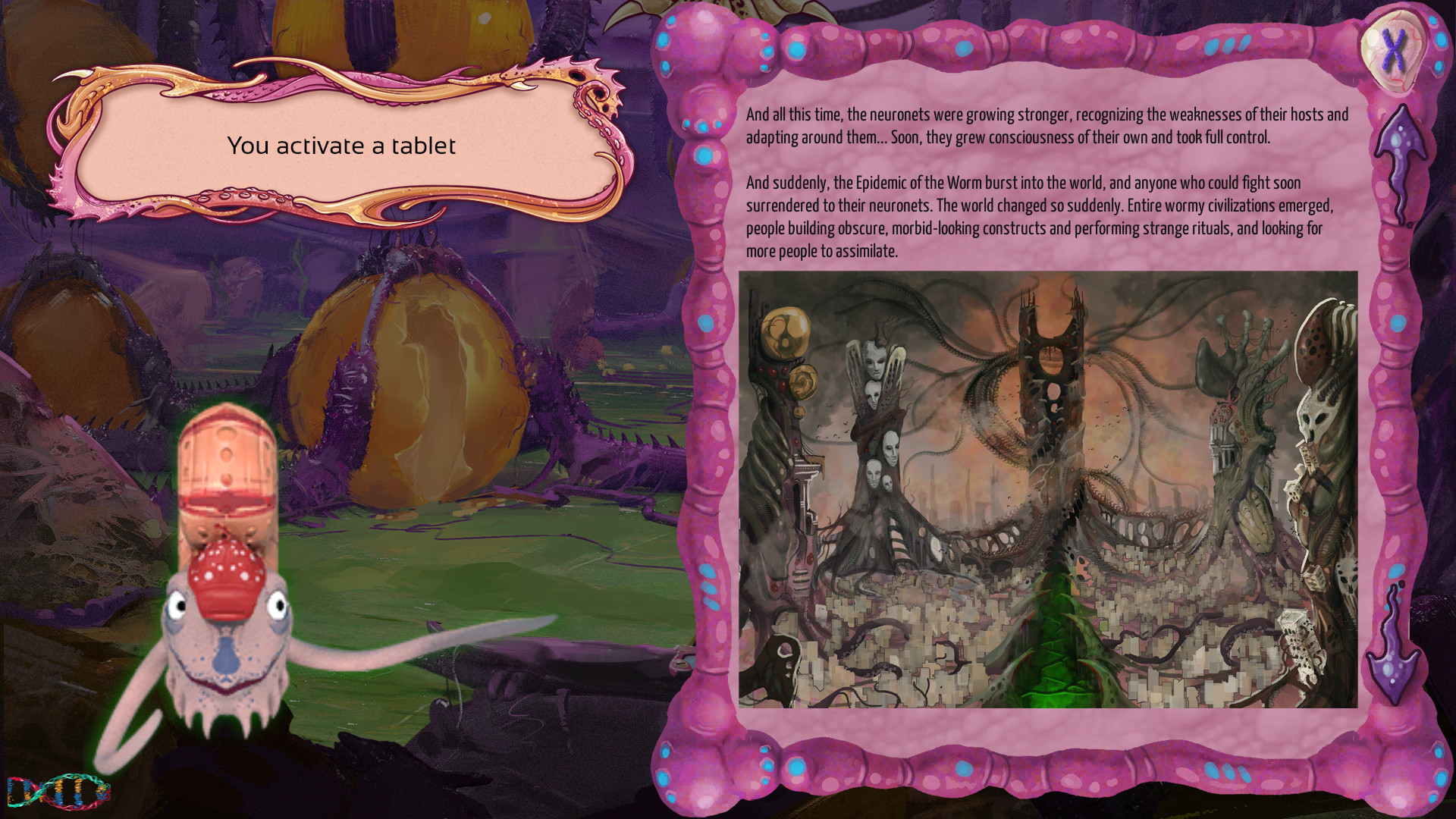 It all started when the neuronet brain-implants were made. They were designed to help people; sort information, filter out bad smells and tastes, clear out your thoughts. Despite claims that the neuronets reprogrammed their hosts instead of adapting to them, they boomed in popularity. The neuronets grew. They integrated, became aware of their hosts' secrets and weaknesses... And then, like a sudden crash of thunder, the Epidemic of the Worm happened, and the human race surrendered to the neuronets. Entire wormy cities now exist where inhabitants perform sinister rites and search for new victims.