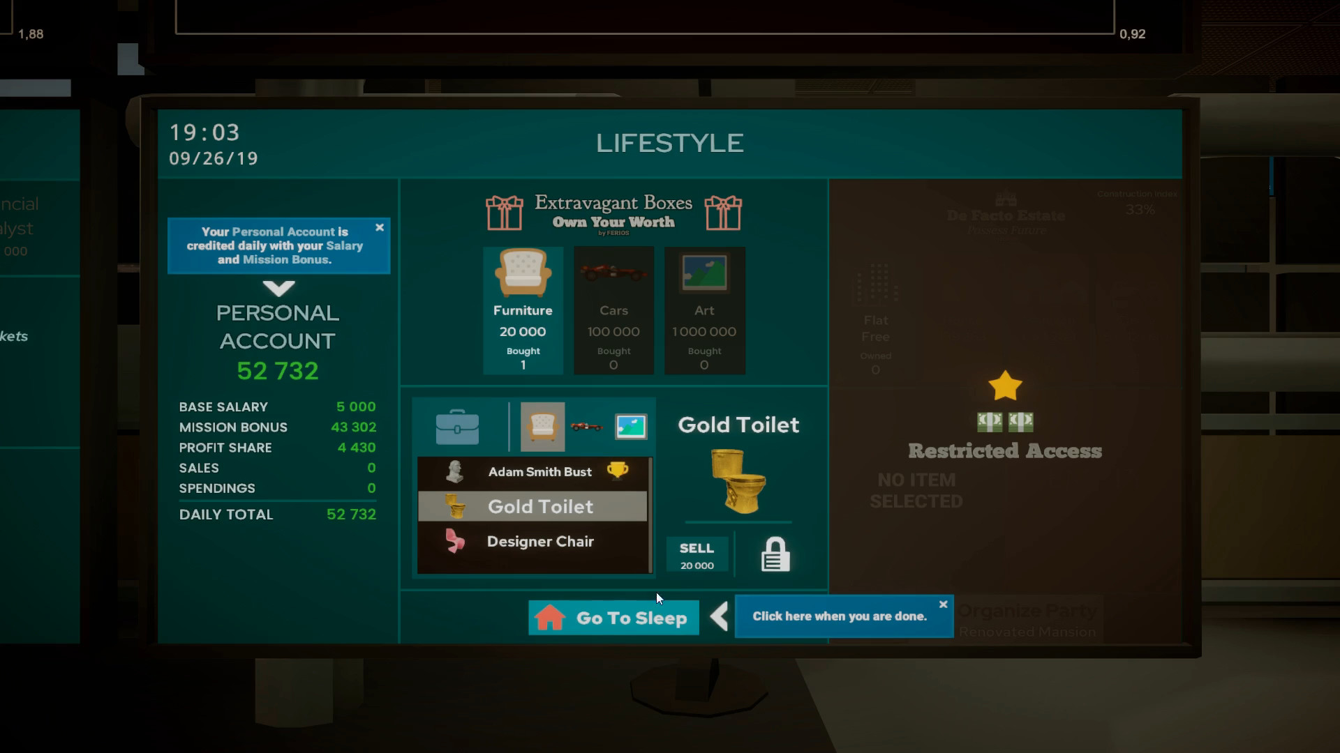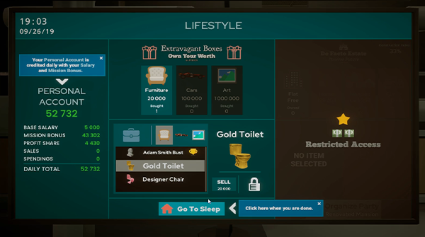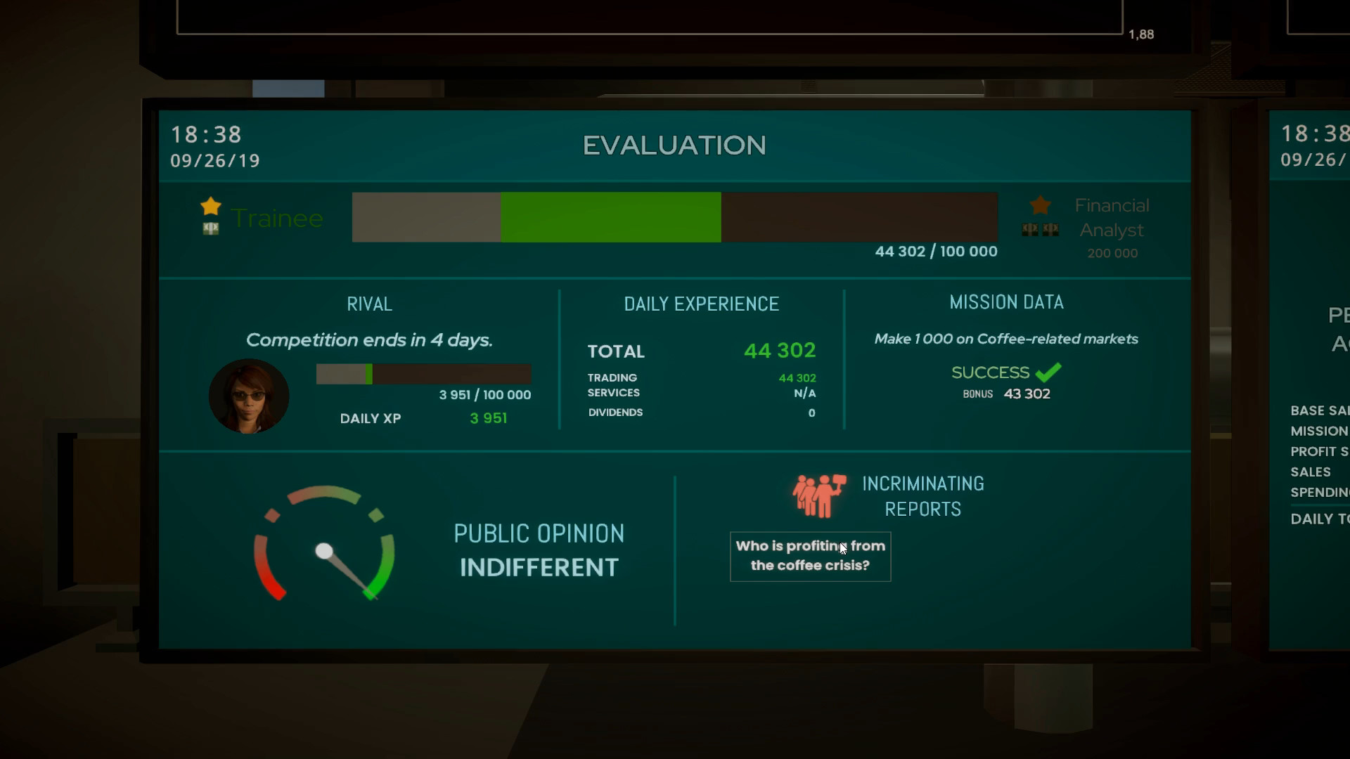 Caught in the hamster wheel of a stock broking agency, your every day is a heady mix of high stakes decision making under pressure. Presented with profit targets by a boss who has no hesitation to sack you, you’ll need to engage in panic sales and timed events, lobby society groups to influence the stock market, and even undertake all-out majority share acquisitions. Read the news to see the signs, or dabble with some insider trading to get the upper edge. But, be warned, a financial investigation into your company has begun, and you may well become the focus.