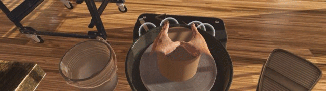 현실에서처럼 두 손을 이용하여 도자기를 빚을 수 있습니다. 실제 사이즈와 동일하게 만들어진 전동 물레를 켜고 흙을 올린 후에 물을 묻혀가며 도자기를 만들어보세요. 굽칼(Trimming Tool)을 이용해서 도자기 표면을 다듬어서 완성도를 올리고 버니어 캘리퍼로 도자기의 크기를 측정하는 것도 가능합니다. 만들어진 도자기 위에 붓을 이용하여 그림을 그리는 것도 가능하고, 조각칼을 이용하여 멋진 무늬를 도자기 표면에 그릴 수도 있습니다.