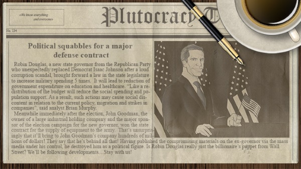 A plutocracy is a form of society defined as being ruled or controlled by a function of wealth. The main idea of the game is to show the interaction of the economy with politics and how influential capitalists make an impact inside and outside politics using the money.