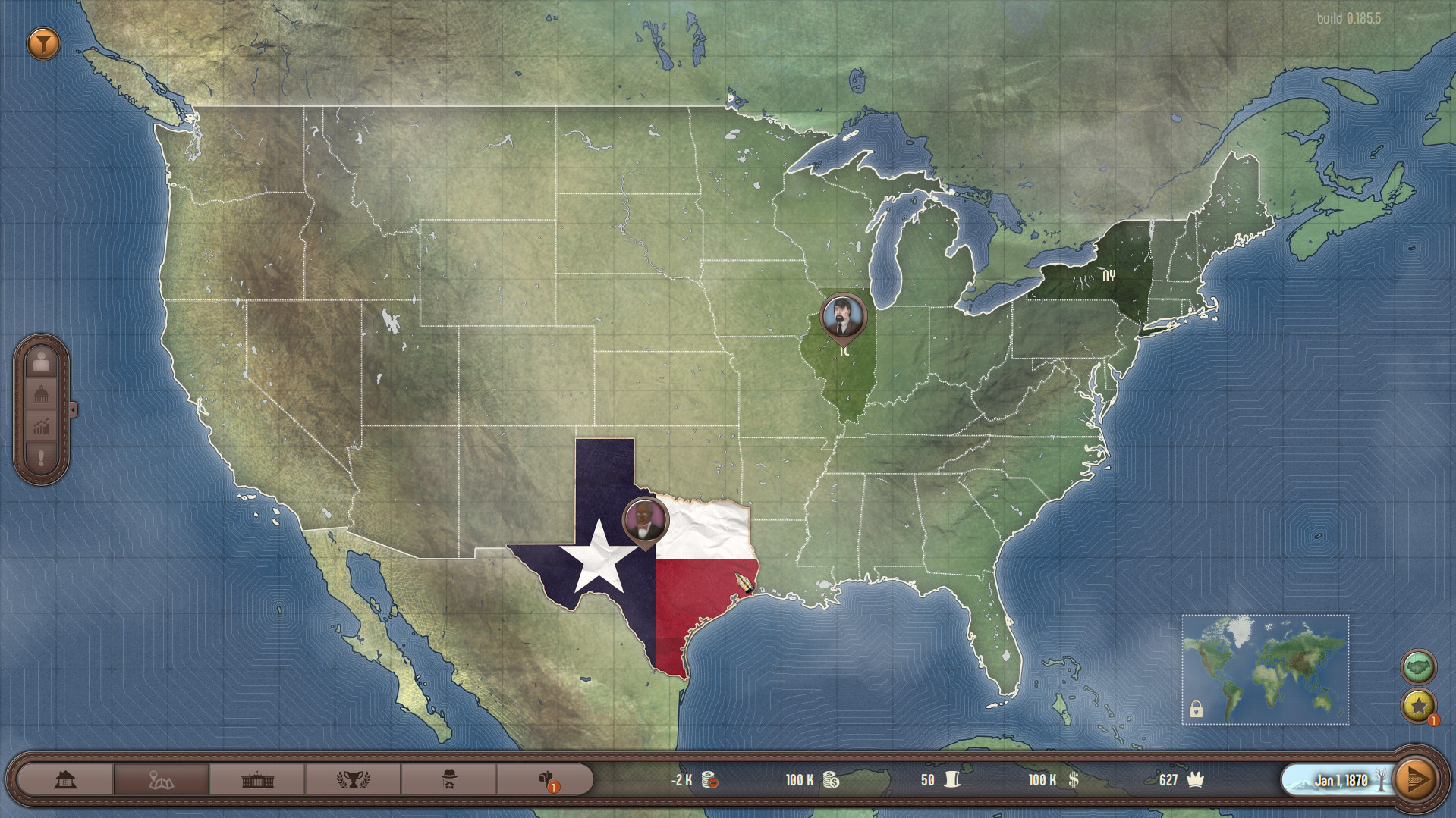 The game starts in 1870 and continues till date. There is an inheritance system where you can leave a bequest to your heirs to go on playing for them! If one of the heirs has analytical abilities and pragmatism, then you should give a financial monopoly to him. If you think that someone is suitable for the position of Senator of the Congress, then you should take care of his election campaign in advance.