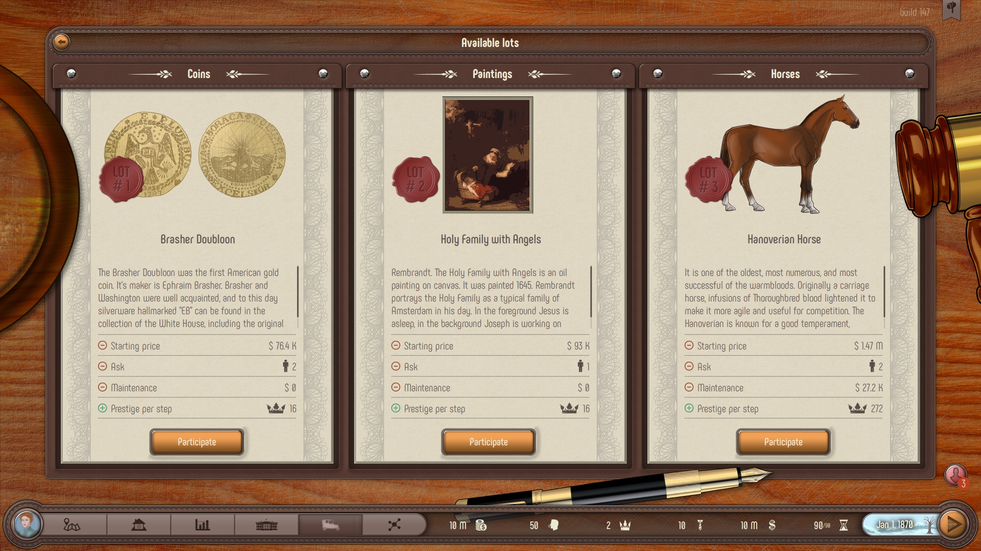Increase your social status by winning luxuries at the auction. Earn money on horse races betting on horses. The price of rare coins or paintings will go up! Don’t forget to buy houses to get annual rent; cars, yachts and planes are a measure of your luxurious life. Any property is a tool for making relationships: if someone collects rare coins or paintings so as you, then it will be easier to make friends with them because of common interests.